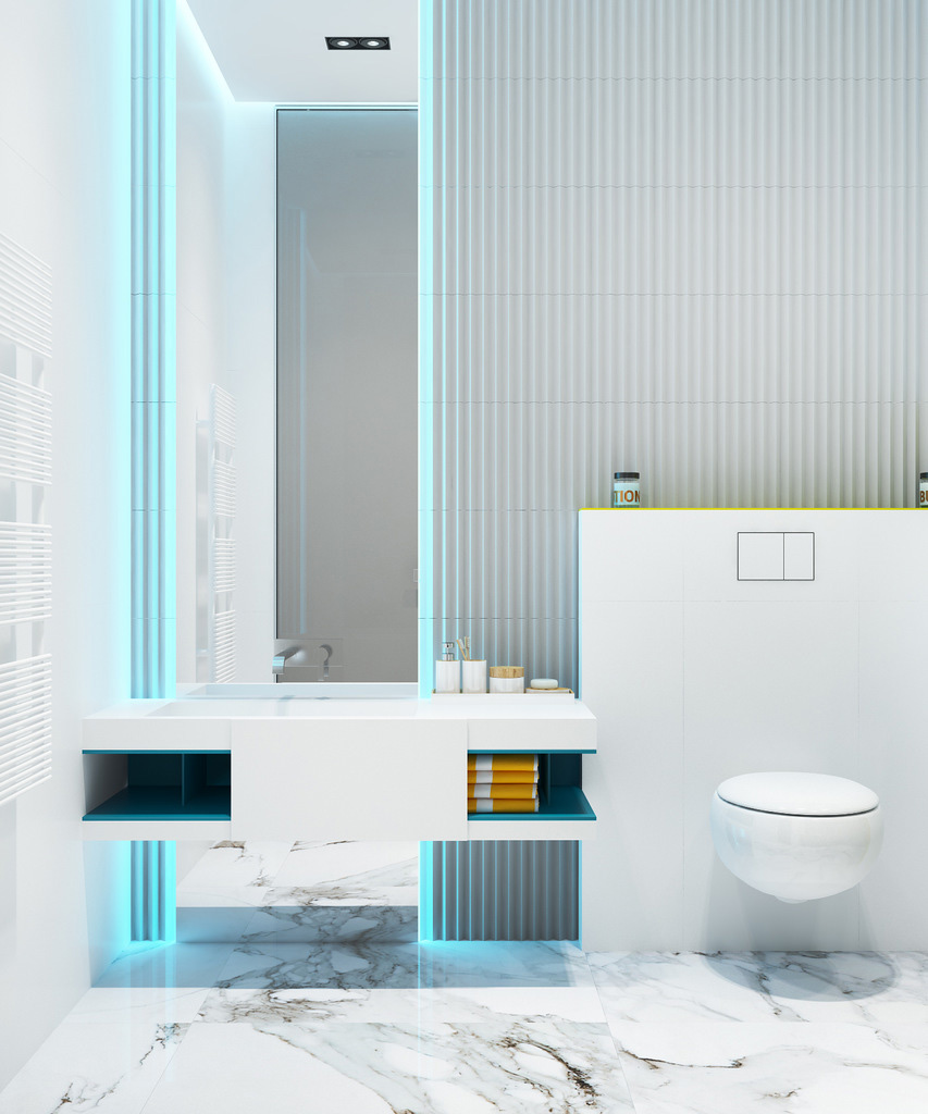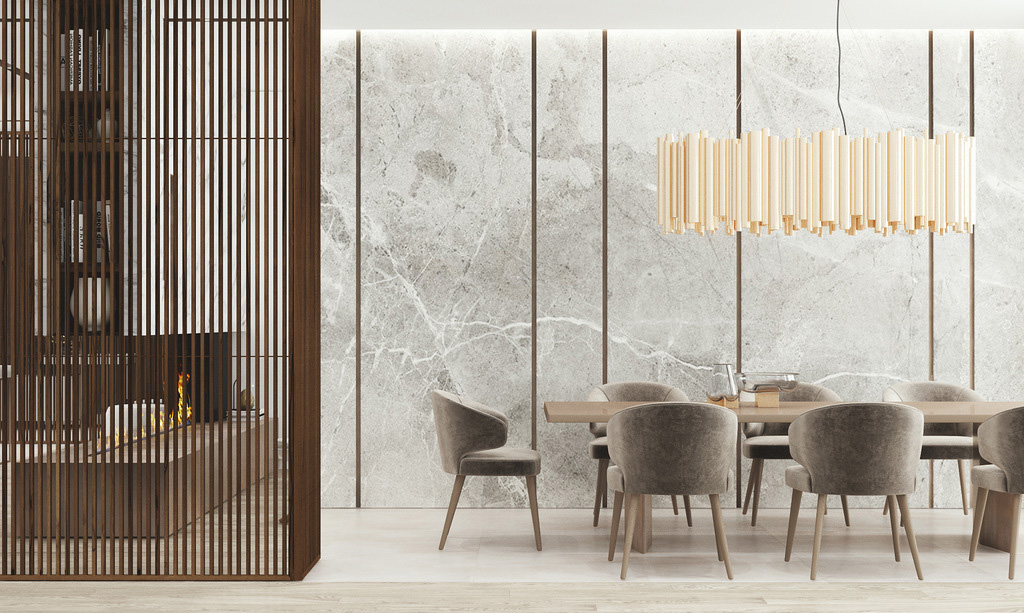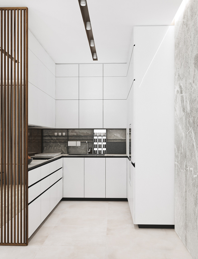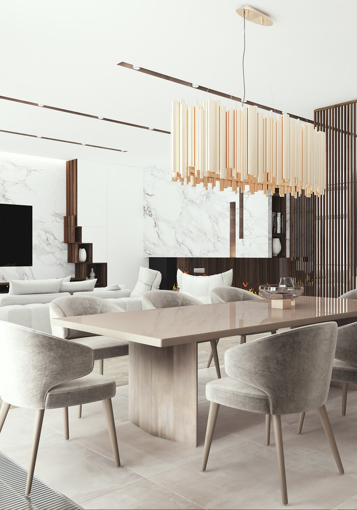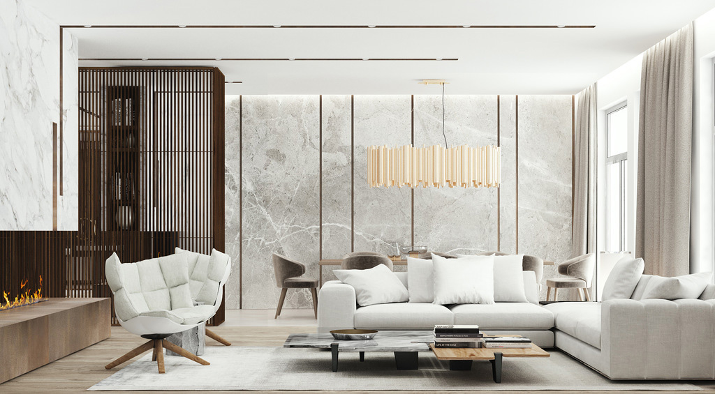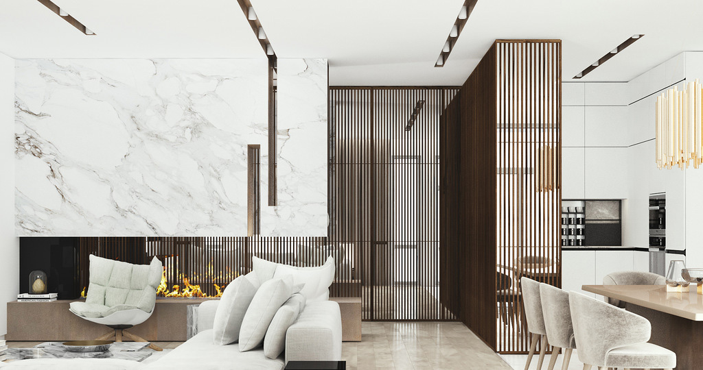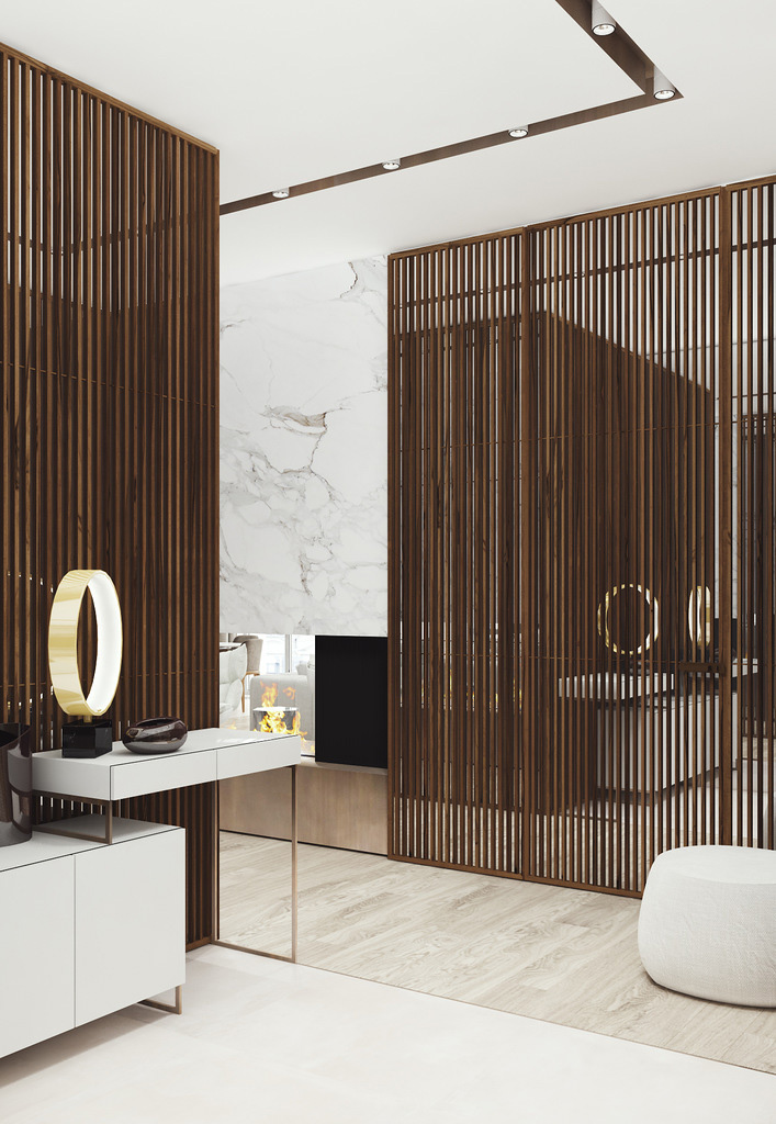 Холл визуально отделен от гостиной большим двусторонним камином, оформленным мрамором. Ниша для света будто прорезает этот архитектурный объем, а латунные вставки гармонично сочетаются с камнем. Зона прихожей, холла и кухни обозначена деревянными брусками, за которыми спрятано зеркало, что визуально удваивает пространство. На кухне серый мрамор дополнен латунной разбивкой.