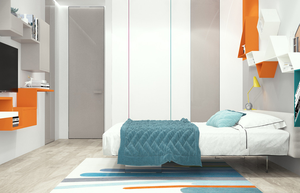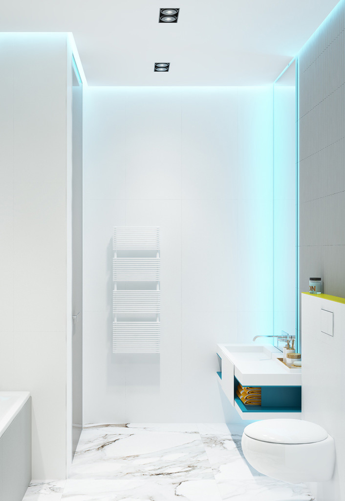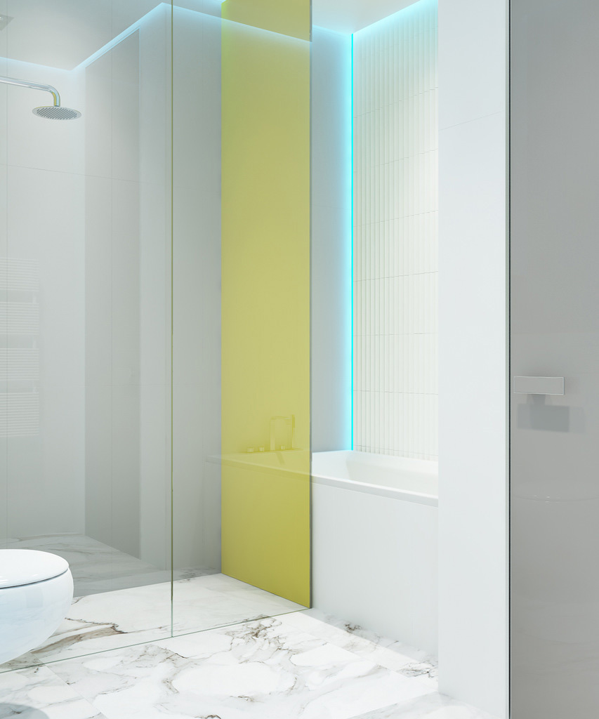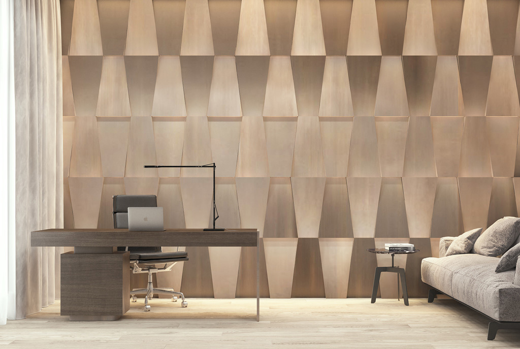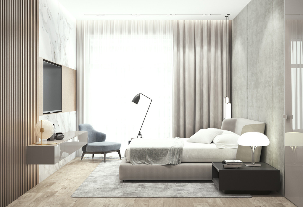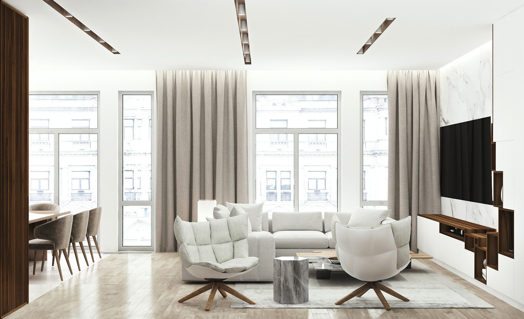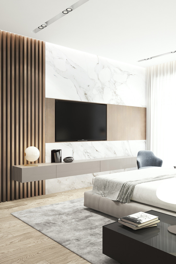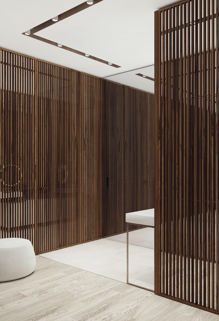 Вся концепция проекта выстроена на контрасте материалов: теплого дерева и холодного благородного камня, солнечной латуни и прохладных зеркал, но за счет нейтральной цветовой гаммы все контрасты уравновешены.