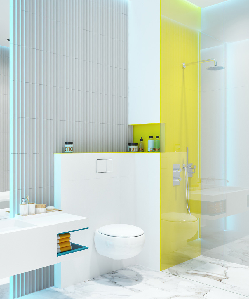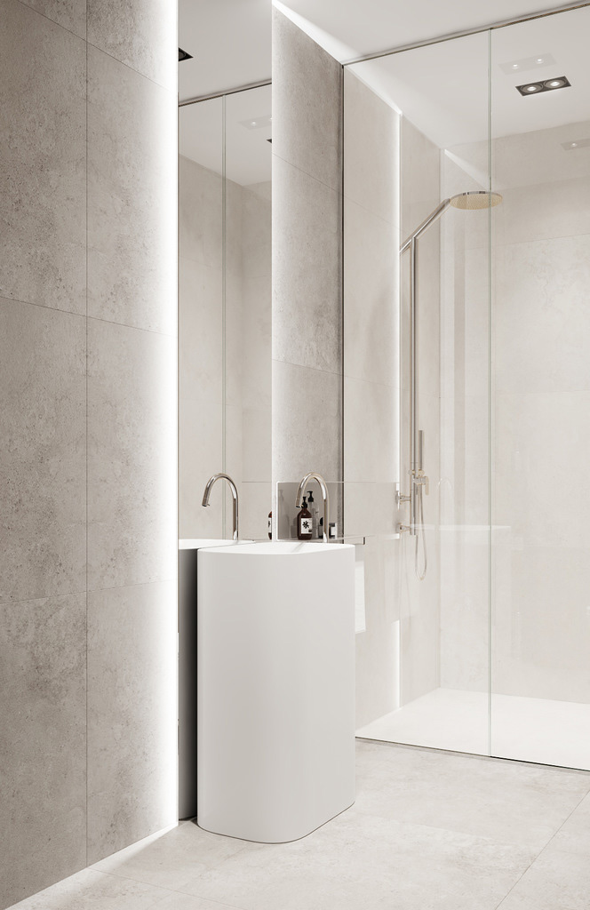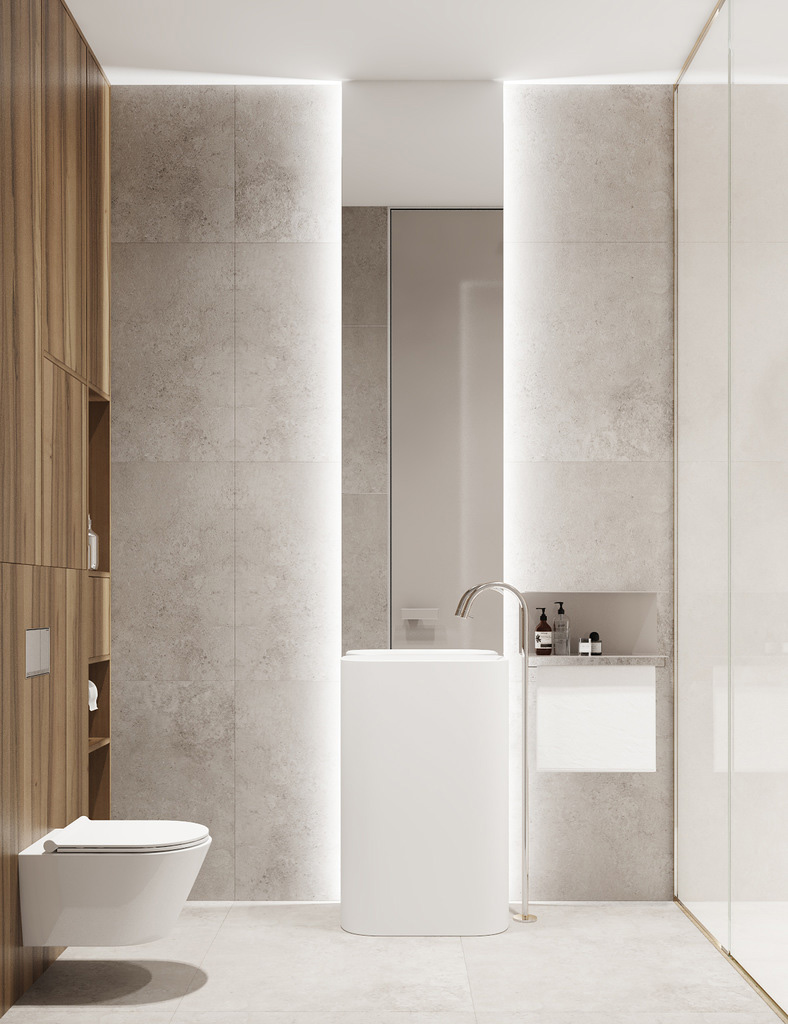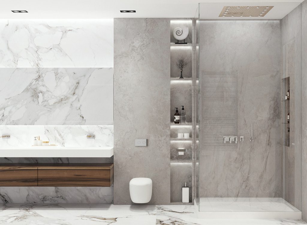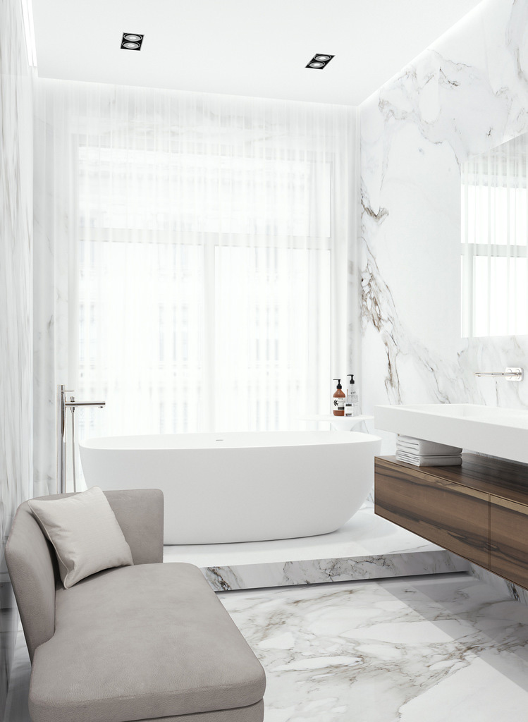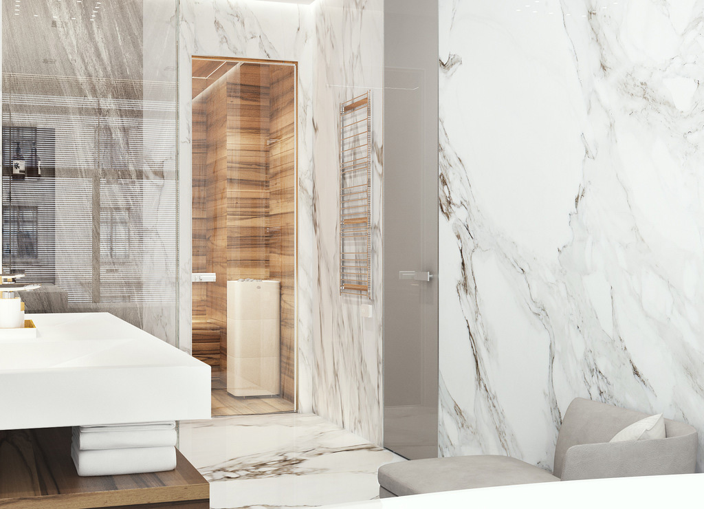 В санузлах и спальнях также в отделке использован камень. В сочетании с латунью и деревом он всегда смотрится благородно и эффектно.