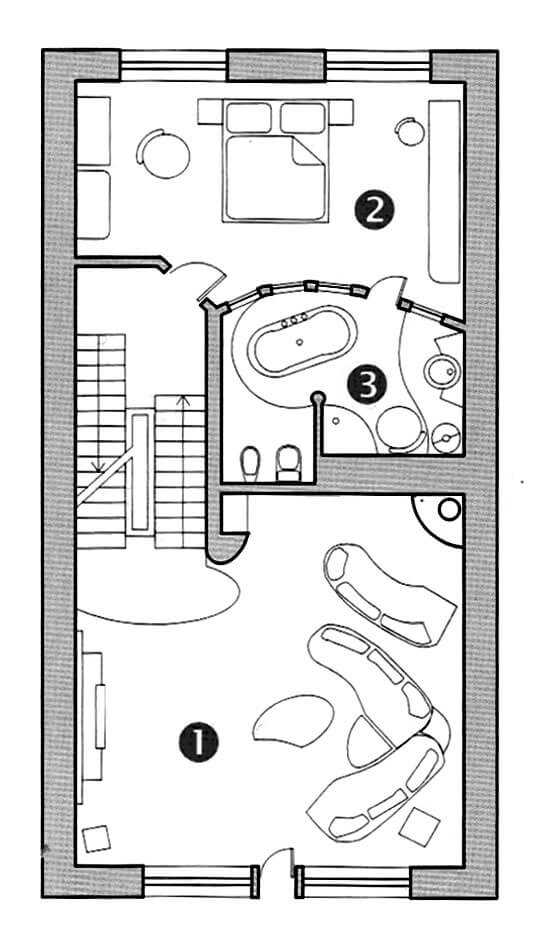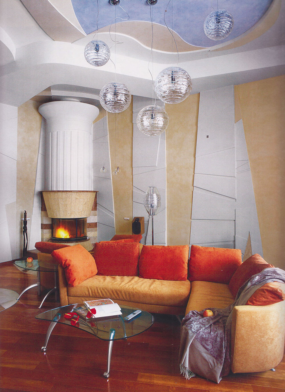 Камин, расположенный в основании стилизованной колонны, имеет особо выраженный классический облик, что подчеркивает его особое место в пространственной композиции гостиной. Мраморная полосатая отделка облицовки камина дополнительно подчеркивает историчность дизайнерской стилистики. Топка камина и постамент облицованы мрамором.