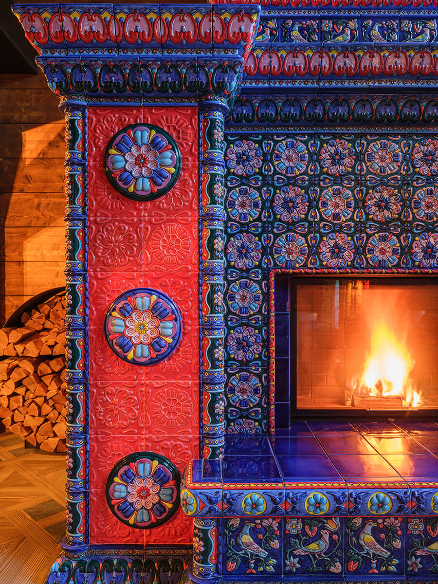 В данном проекте мы использовали стандартную коллекцию изразцов, а для того, чтобы придать ей индивидуальности, разработали свое цветовое решение для каждого элемента. Подбор цвета является базовой опцией, которую мы предлагаем всем клиентам. Посмотрите, как мы сочетаем между собой разные по форме элементы, а также миксуем однотонную керамику и расписную. Второго такого камина просто нет.