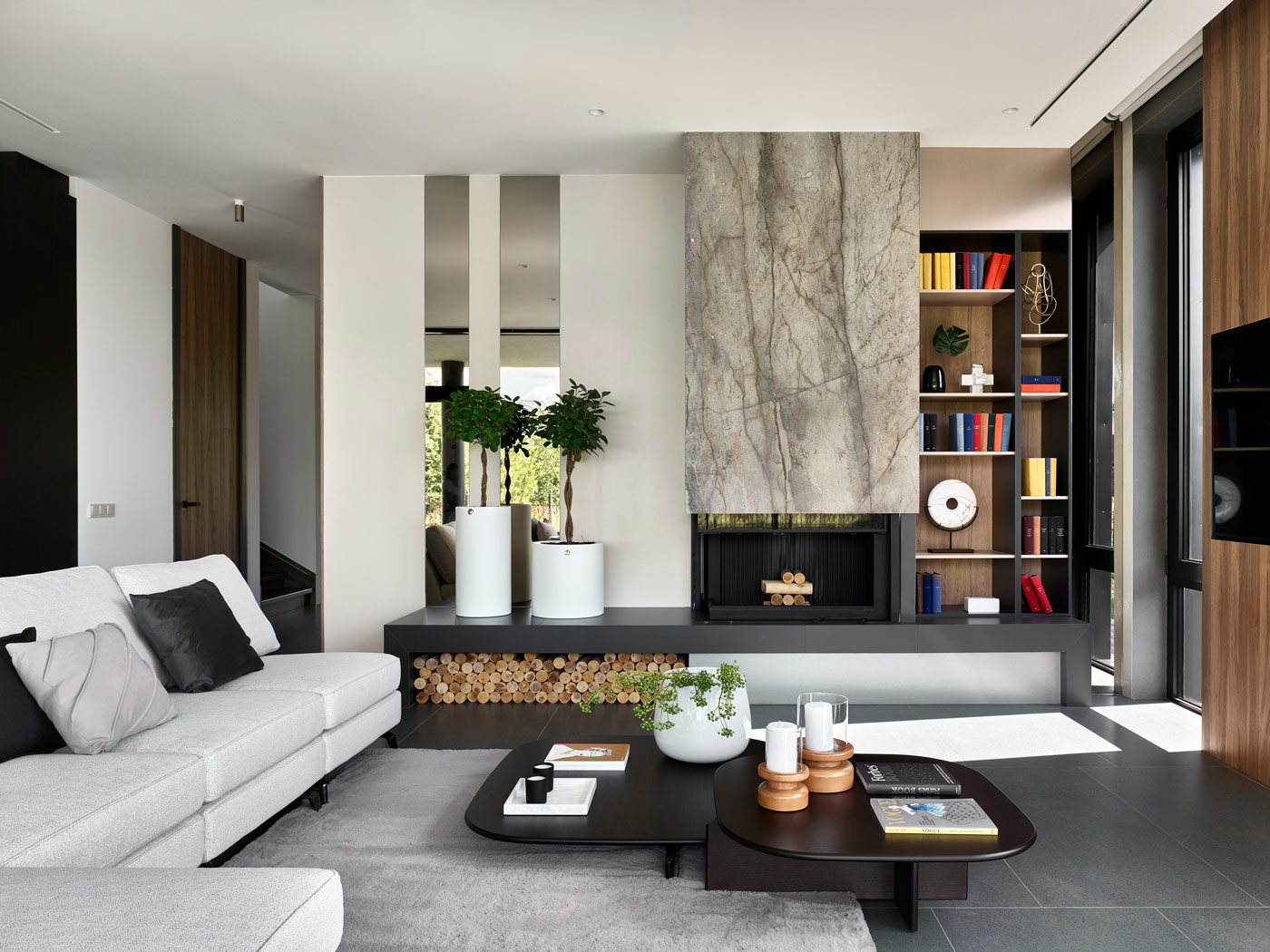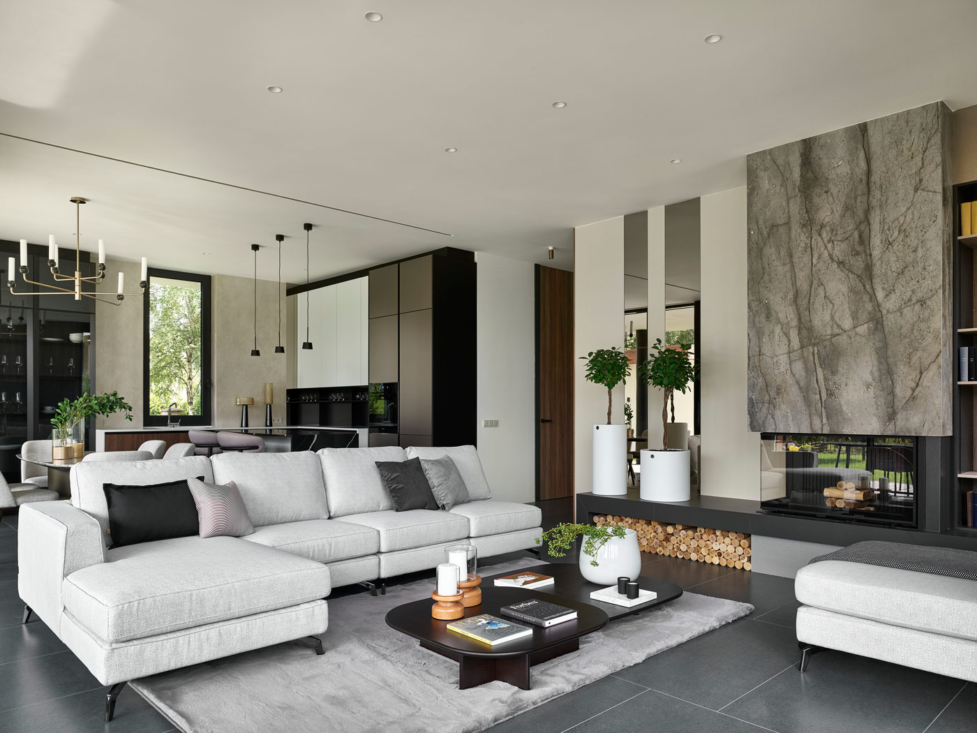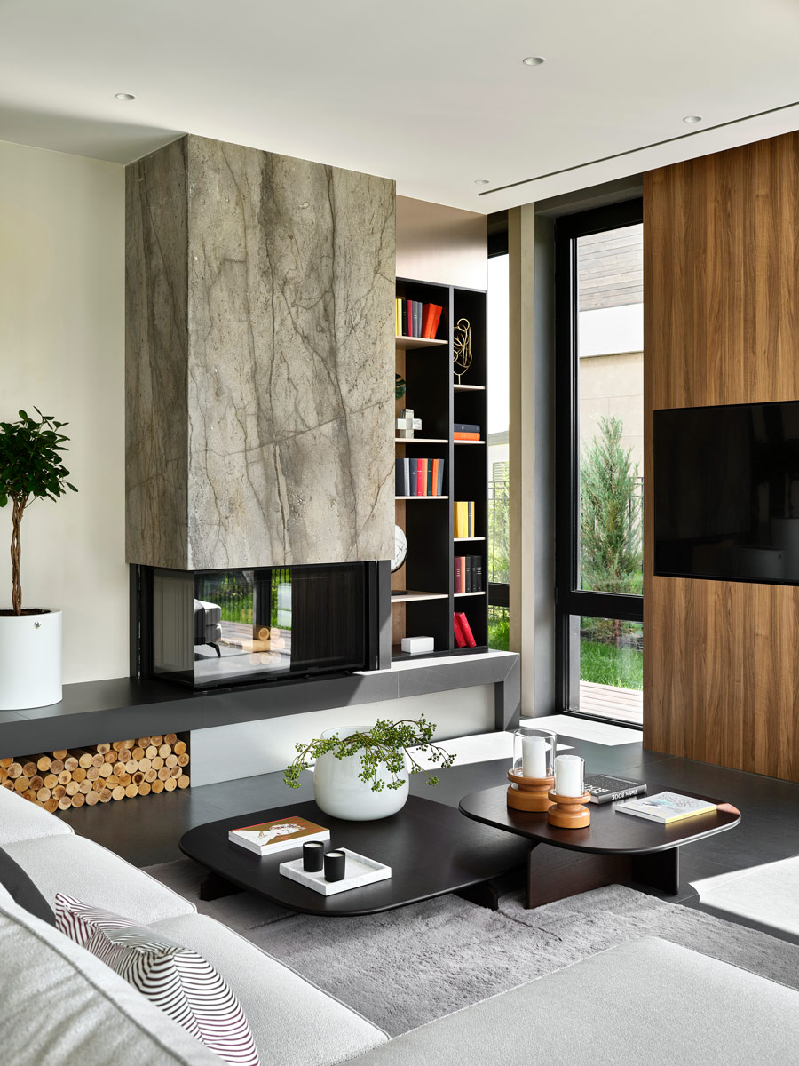 Монументальность зоны камина подчеркивается сочетанием серого струящегося мрамора и контрастных элементов, добавляющих силуэтам глубину и выразительность. Угловая остекленная топка создает уютную атмосферу и позволяет наслаждаться видом пламени из разных точек комнаты. В отделке стены используются зеркала, которые не только добавляют простора и света, но и увеличивают визуальный эффект пламени, придавая гостиной изысканный и элегантный вид. Под камином размещено удобное хранение для дров, которые стали неотъемлемым элементом дизайна, придающим пространству ощущение тепла и уюта.