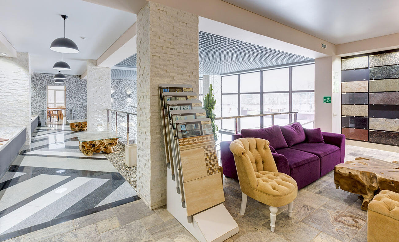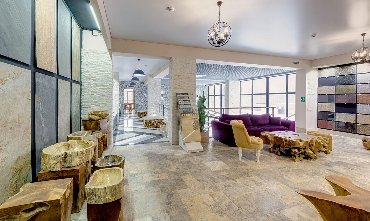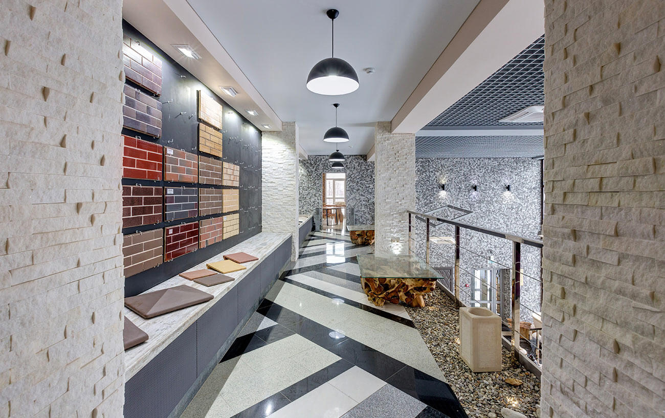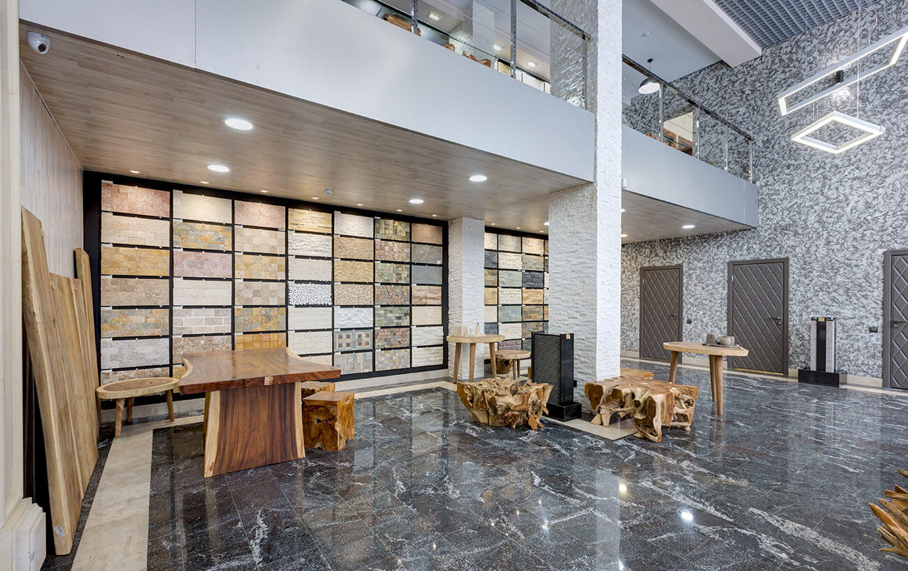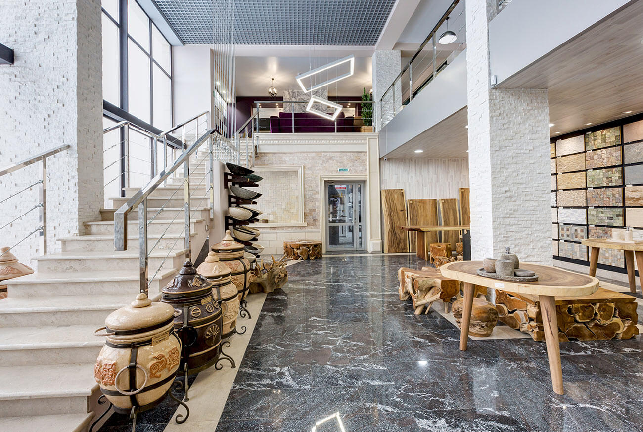 В названии интерьера выставочного зала можно смело использовать приставку «эко», так как материалы для отделки помещения, а также мебель и камин выполнены с максимальным применением натуральных, природных материалов.