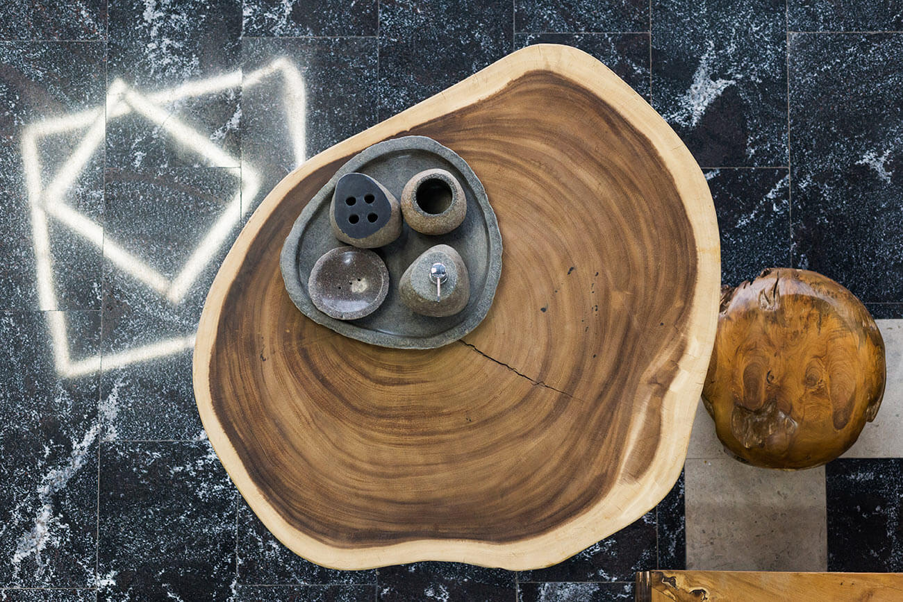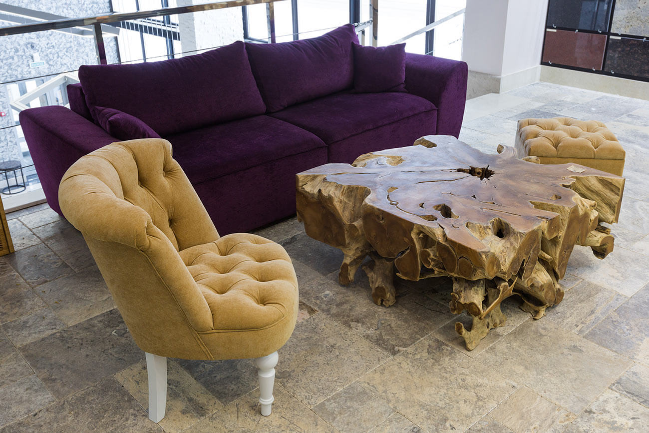 Еще заслуживает внимания напольное покрытие каминной зоны. Это натуральный камень — травертин Silver, имеющий интересную раскладку под названием «французский сет». Мягкая мебель выполнена на заказ. Журнальный стол сделан из корня дерева суар и приехал к нам из Индонезии.