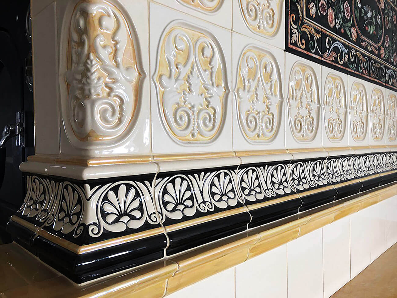 Бежевую гамму изразцов обогащают перламутровые переливы люстра, который был нанесен на глубину рельефа.