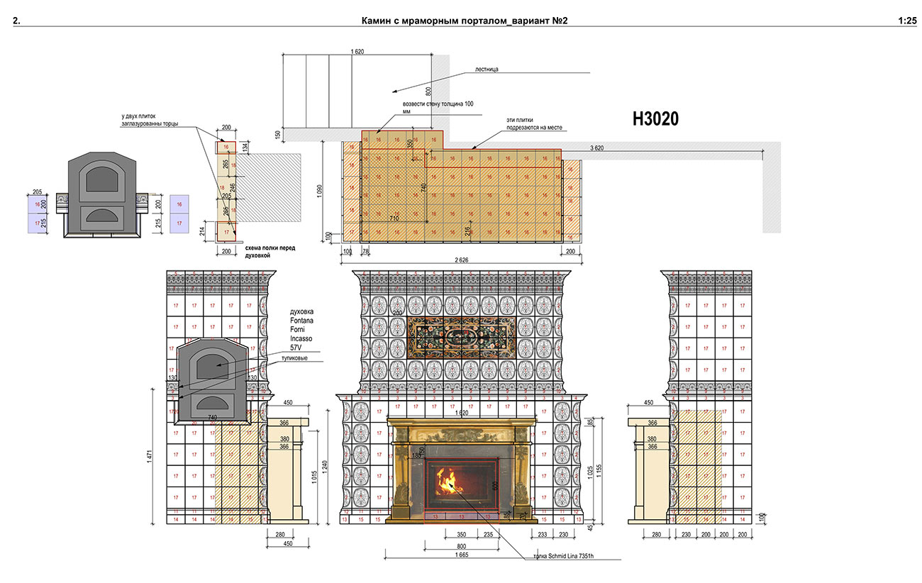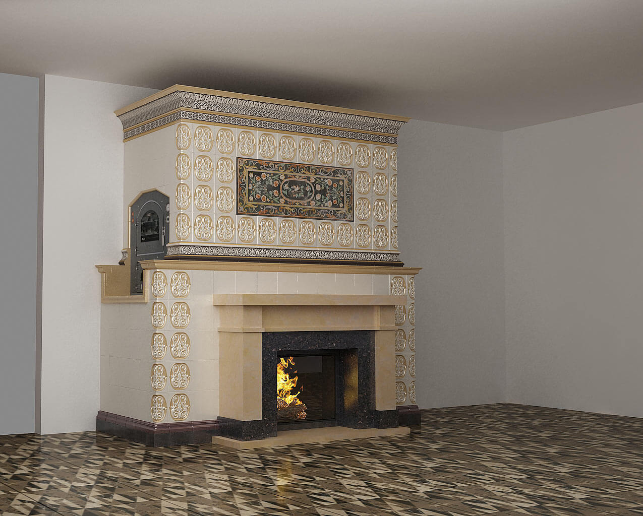 История этого камина началась с роскошного мраморного портала, который заказчице привезли друзья в подарок из Италии. Он определил дизайн изразцовой облицовки и навеял роспись центрального панно, которая напоминает картины, выполненные инкрустацией из мраморных пластин.