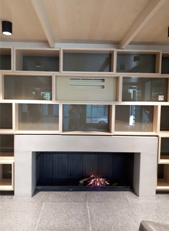 Черная футеровка топки и брутальная бетонная рамка обрамления добавляют элементы брутальности в общую композицию.