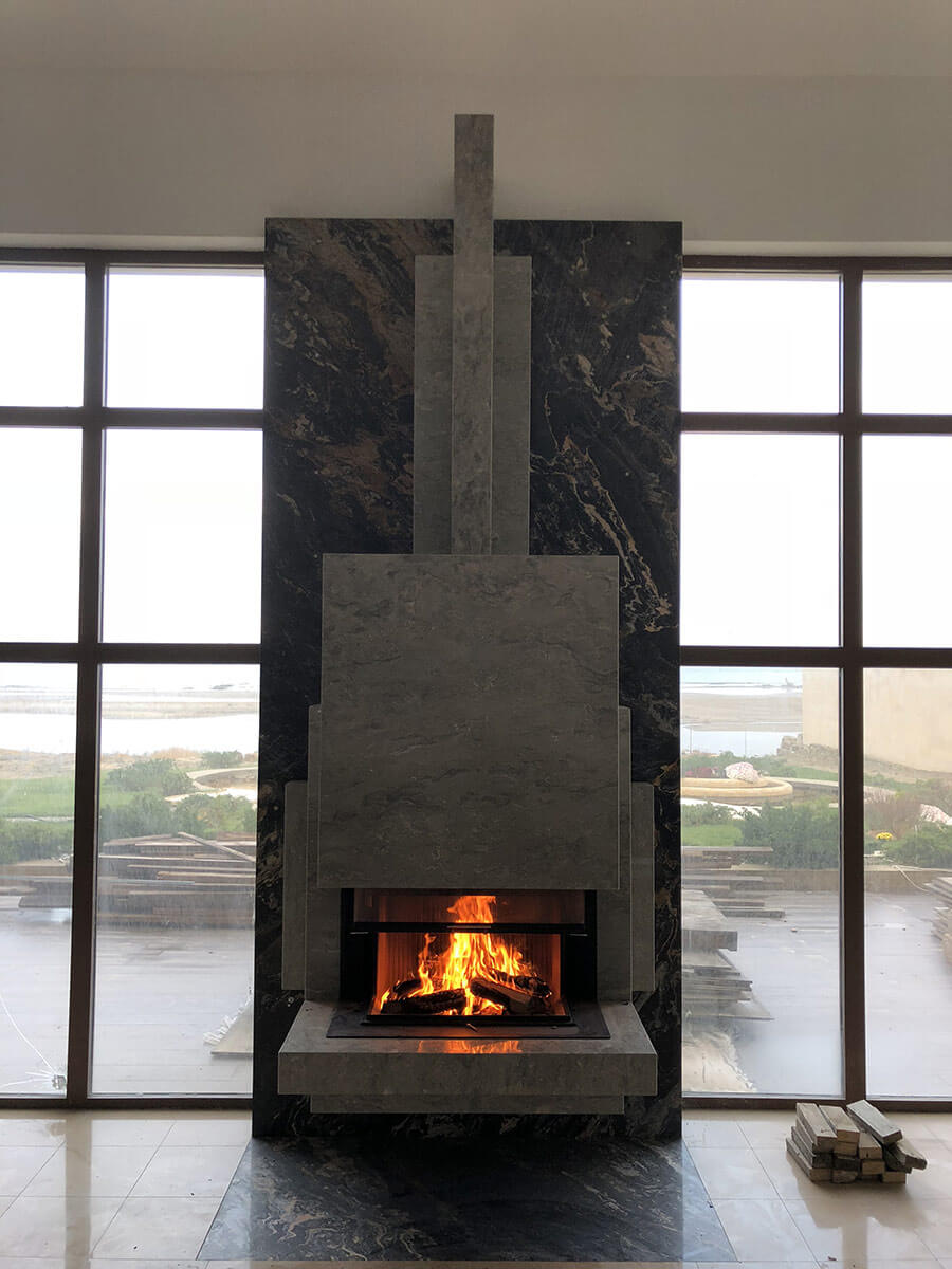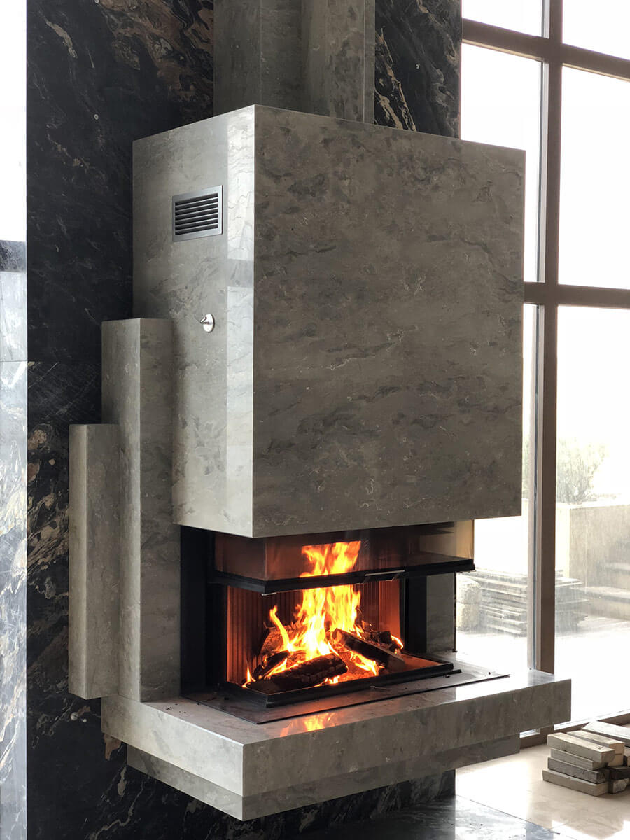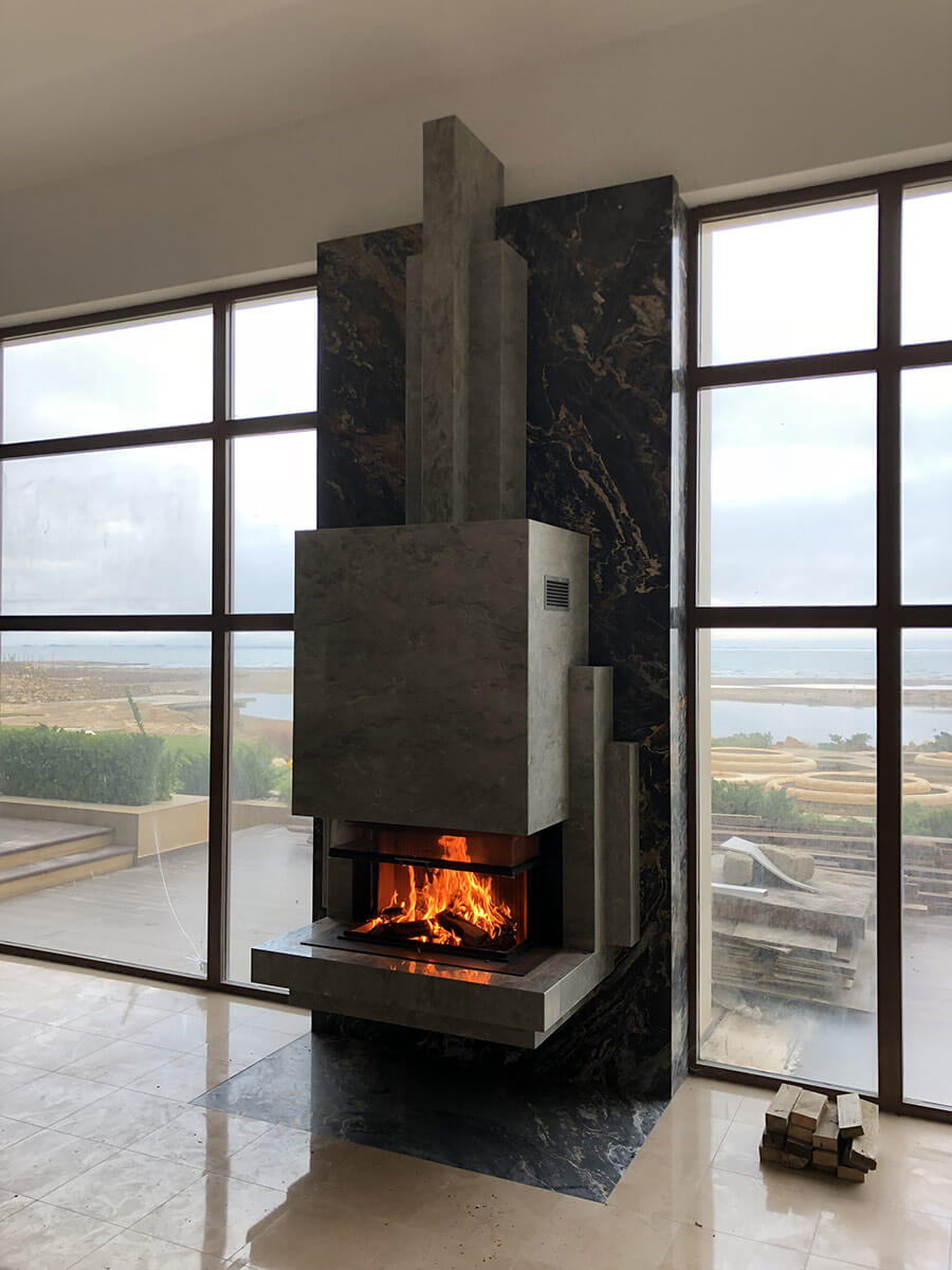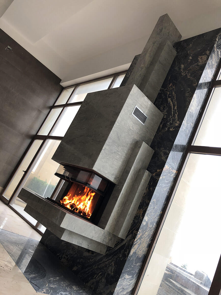Именно такое энергетическое состояние возникает сидя у работающего камина, глядя на бушующее море за окном. Камин является подвесным, что придает легкость и создает парящий эффект, несмотря на его габариты (высота 4500 мм). Выполнен из итальянского мрамора, детали врезаны вручную (ручными инструментами). Проектирование – 2017 год, реализация – 2018.