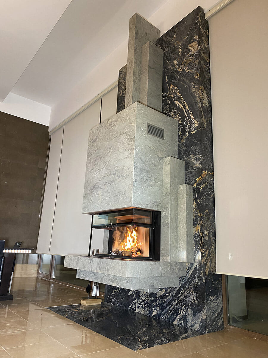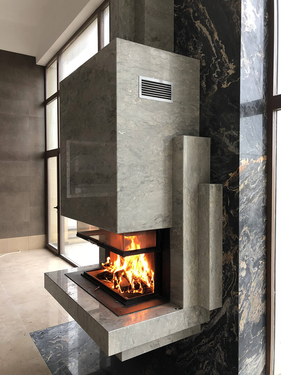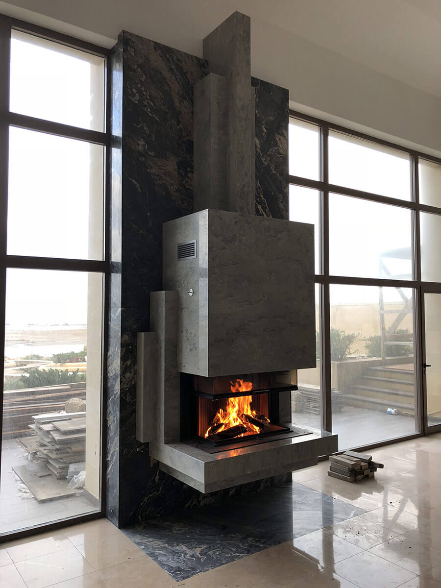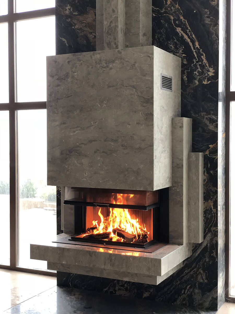 Именно такое энергетическое состояние возникает сидя у работающего камина, глядя на бушующее море за окном. Камин является подвесным, что придает легкость и создает парящий эффект, несмотря на его габариты (высота 4500 мм). Выполнен из итальянского мрамора, детали врезаны вручную (ручными инструментами). Проектирование – 2017 год, реализация – 2018.