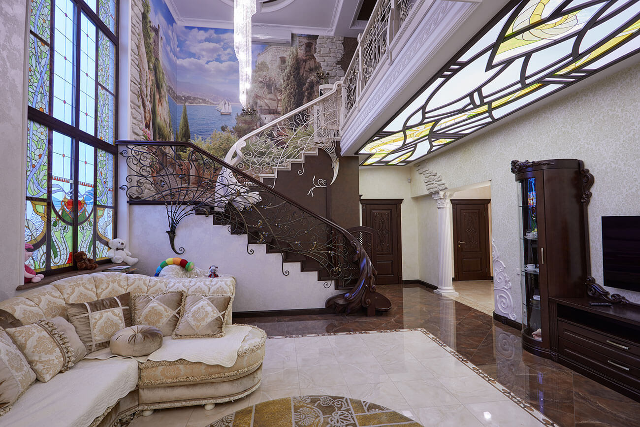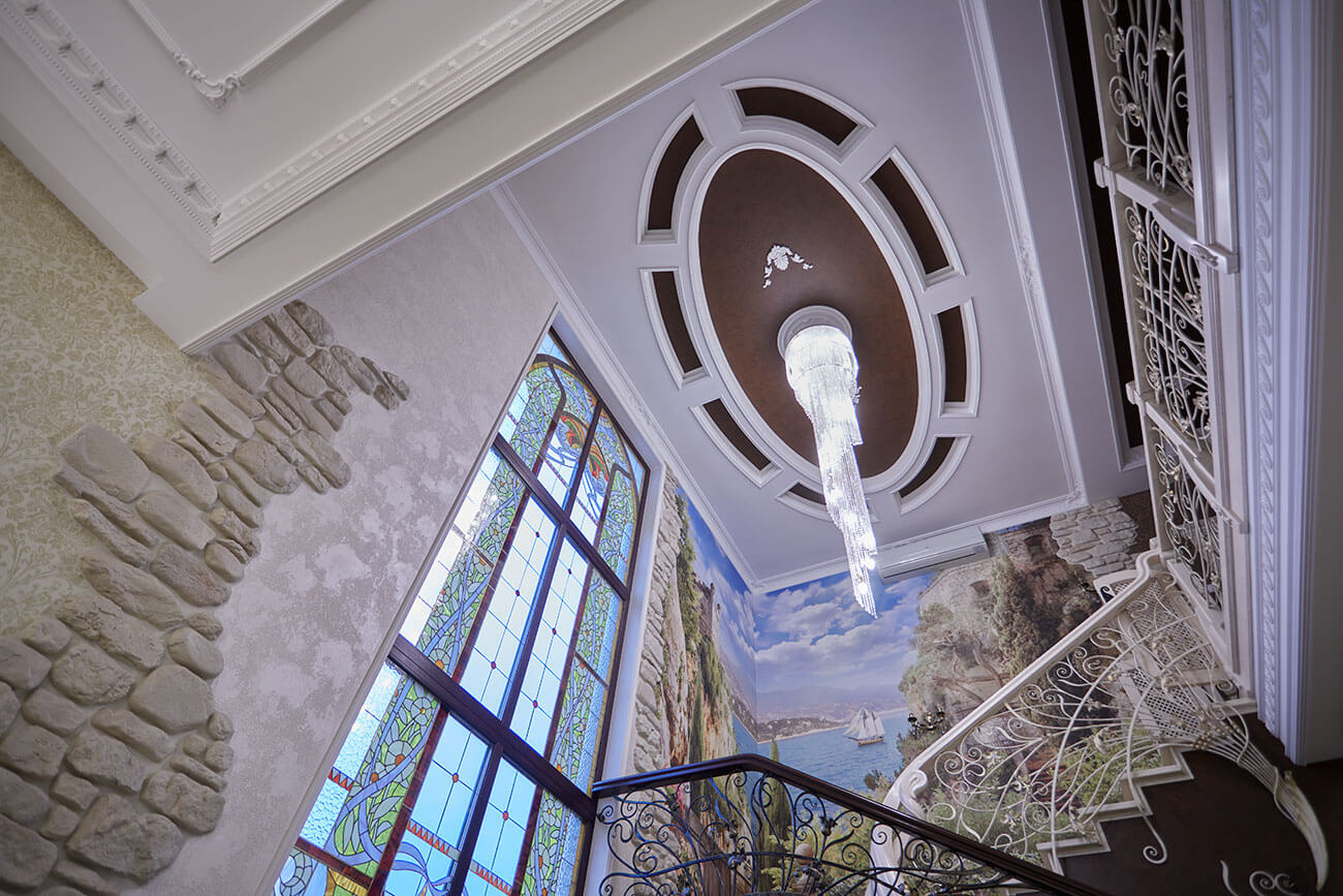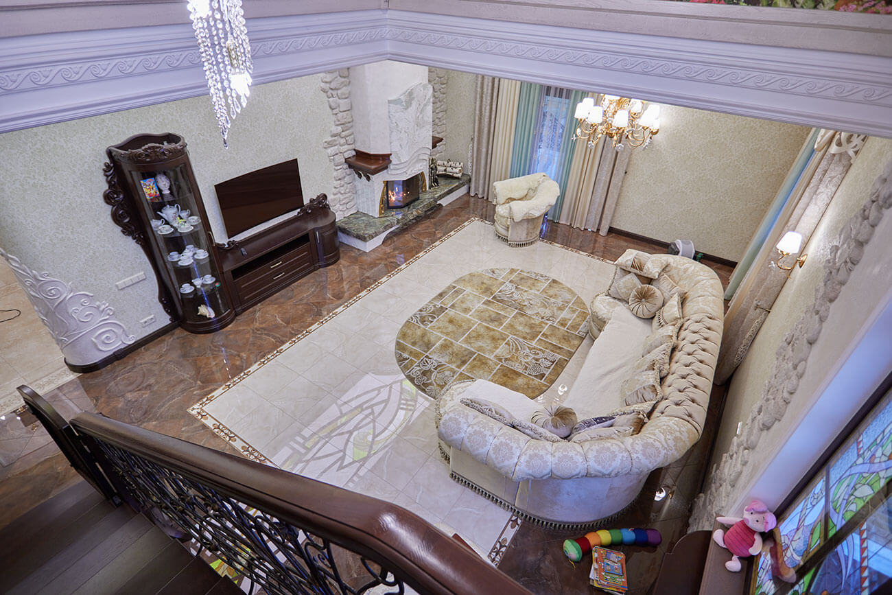 Дизайн интерьера загородного дома создавался исключительно карандашом. Это главная его особенность. Потому в нем так много криволинейных элементов, растительного орнамента, вычурных деталей… Все это вполне отвечало требованиям заказчика.