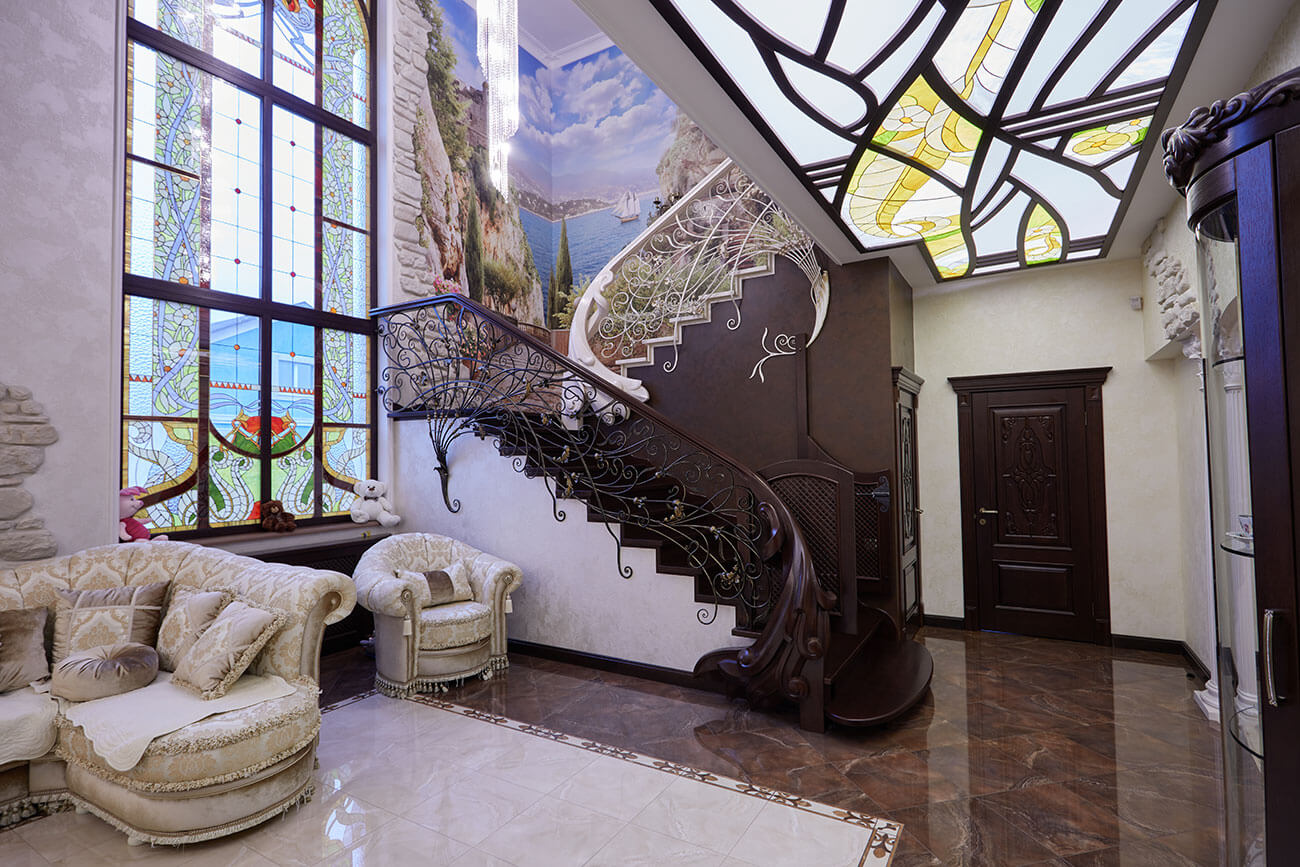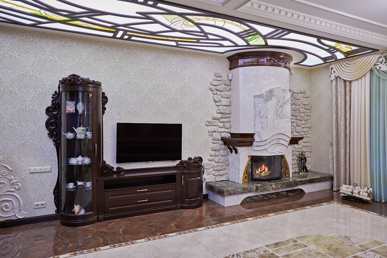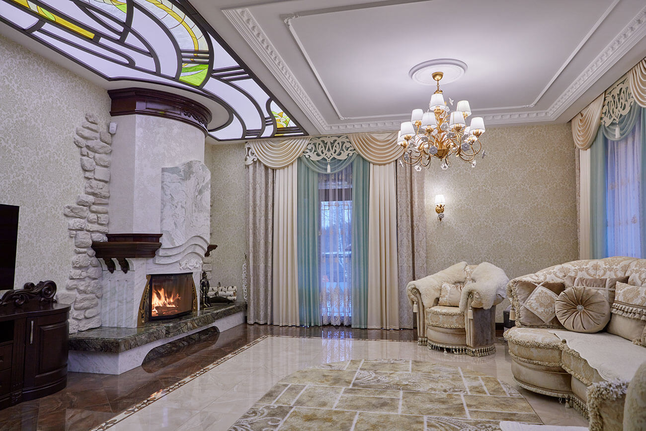 Дизайн интерьера загородного дома создавался исключительно карандашом. Это главная его особенность. Потому в нем так много криволинейных элементов, растительного орнамента, вычурных деталей… Все это вполне отвечало требованиям заказчика.