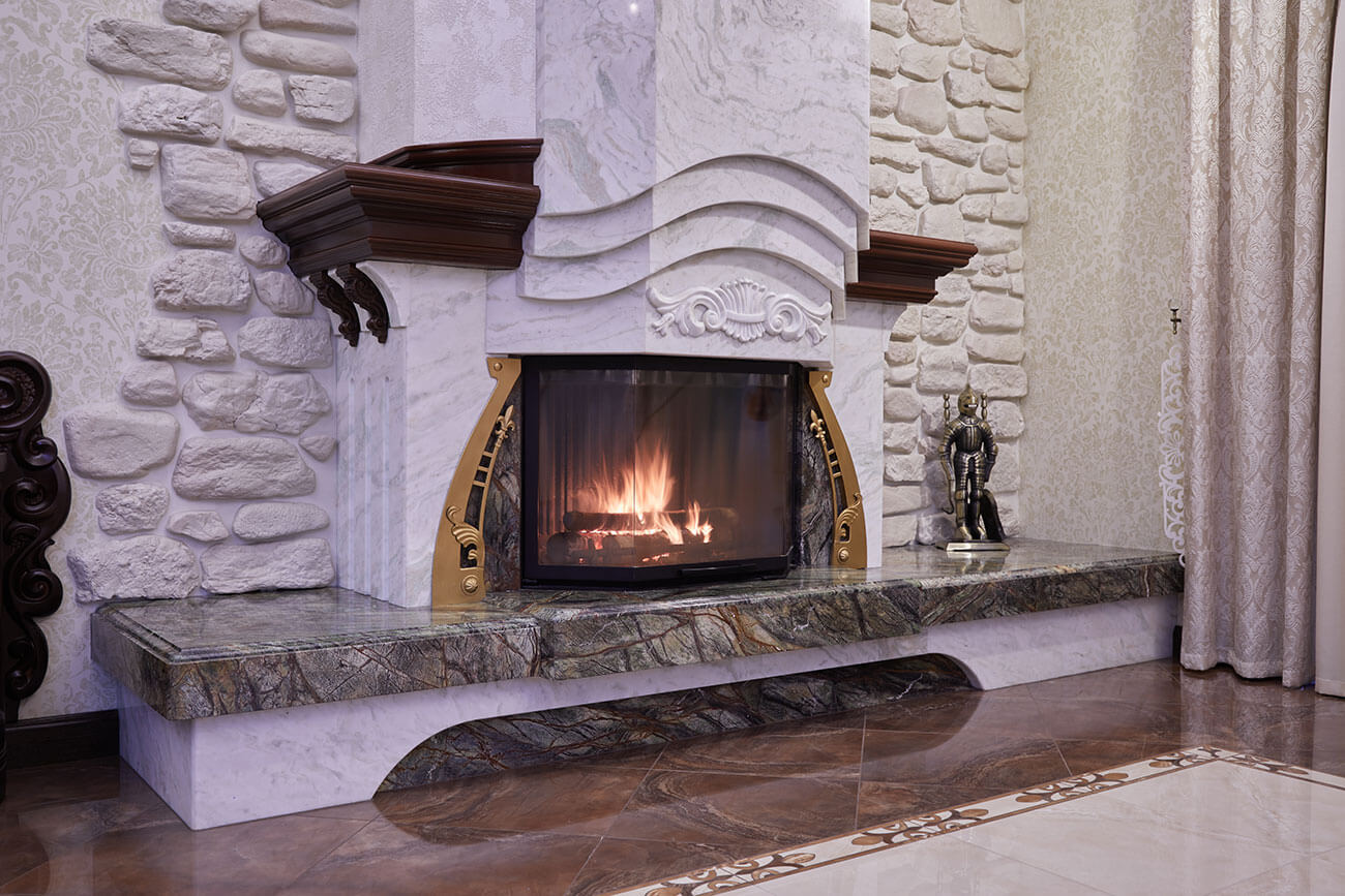 Конечно, сначала делались чертежи. Но даже на них линии упорно не хотели сходиться в нужном месте. Боковые деревянные полки должны повторять прямоугольный контур камина и сопрягаться с верхними элементами, которые в свою очередь огибают полукруглый кожух, радиус которого строго задан параметрами топки. Торцы деревянных элементов должны сходиться в нужных точках на призматическом мраморном фасаде. И не выходить за его габариты. Три волнообразные линии сделаны на гидрорезе и мучительно доработаны «болгаркой», тоже в свою очередь задают ограничения. Кроме того, мраморный фасад, зависающий над топкой, оказался невероятно тяжел и неудобен при монтаже.