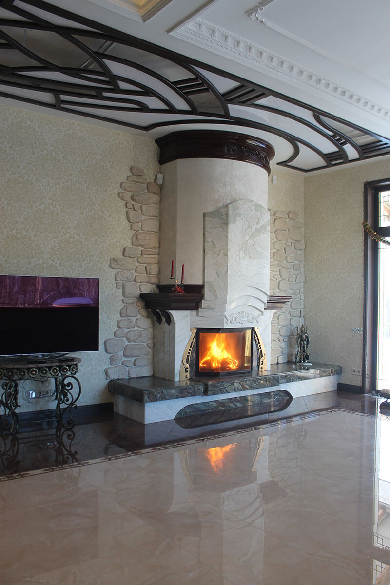Эскиз был создан быстро, не отрываясь, как говорится «одним кадром». И также легко согласован с заказчиком. Теперь нужно не только отвечать за каждую линию но и воплотить задуманное в камне и дереве… Даже при большом опыте строительства каминов это оказалось совсем не просто.