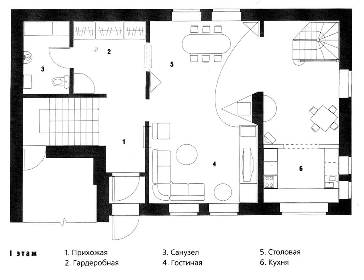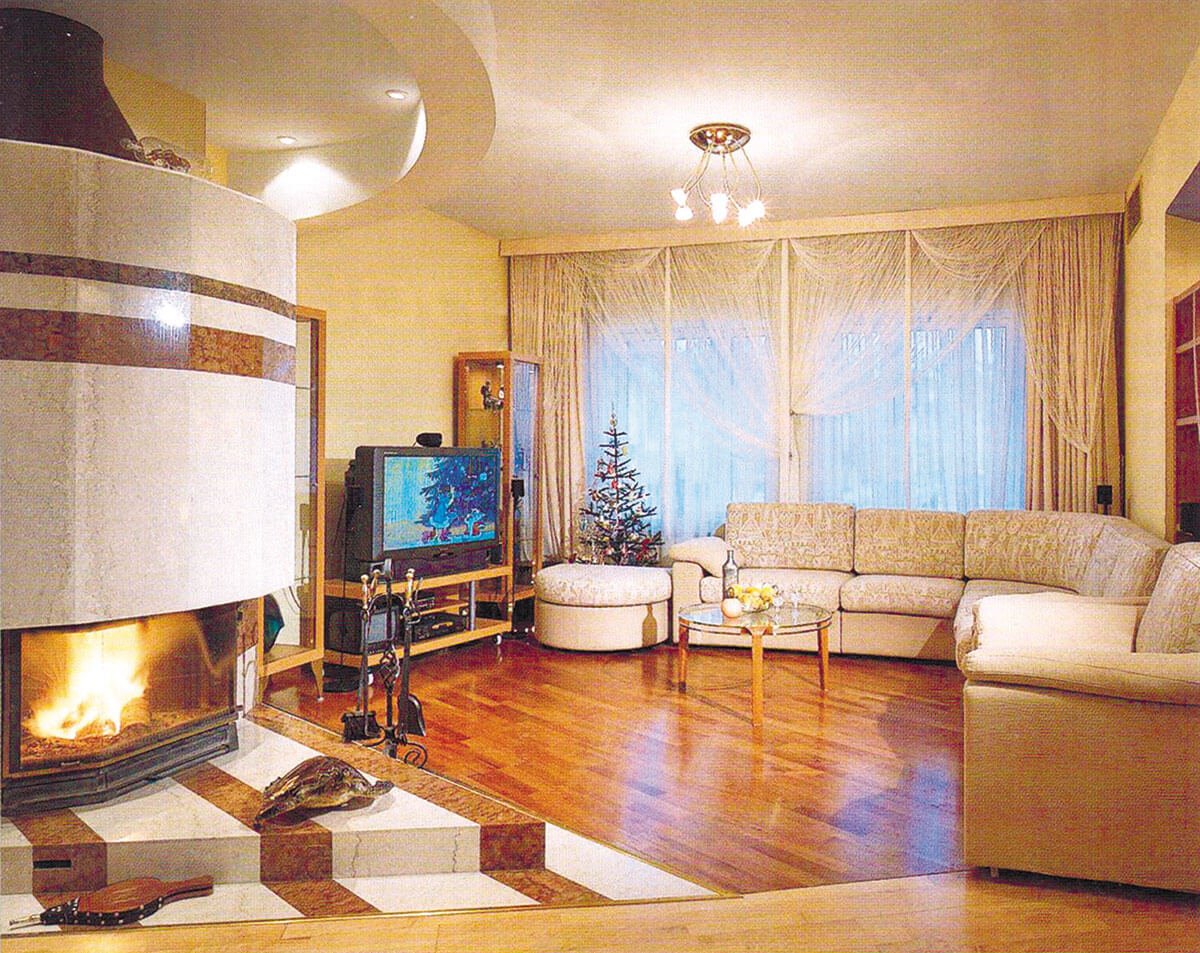 Цилиндрический объем брутального камина с острым треугольным подиумом визуально разделяет пространство гостиной и столовой, являясь при этом доминантным акцентом всей объемно-планировочной композиции. Венчает камин белый изящный завиток, выделенный в пластике потолка, завершая общую пластику камина и создавая особый акцент индивидуального визуального облика. Топка камина и постамент облицованы мрамором.