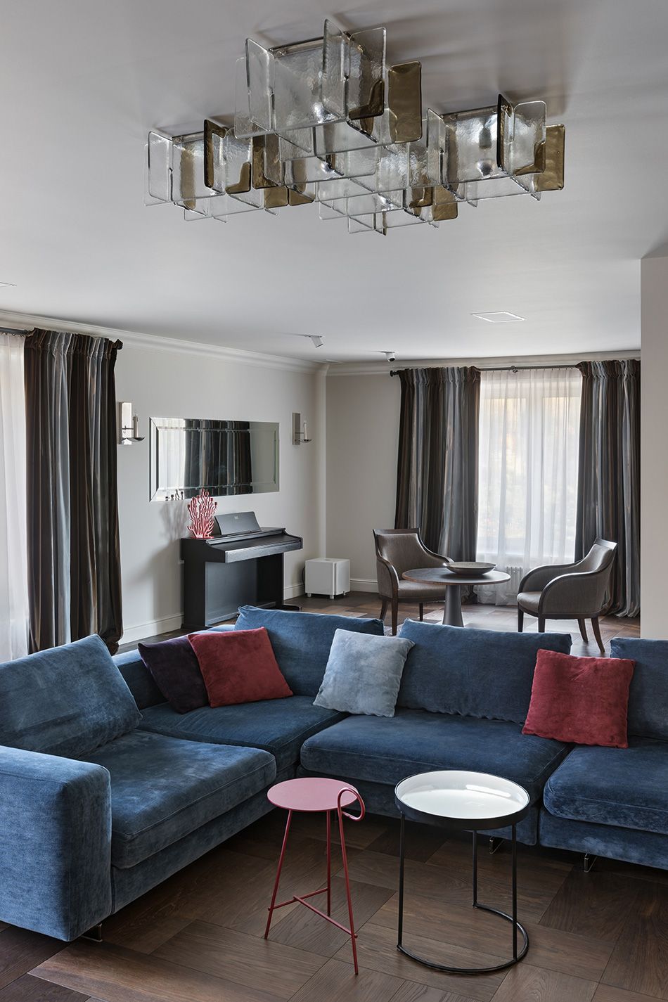 Панели по обеим сторонам от каминной топки, а также площадка перед камином выложены стеклянными плитками ручной работы.