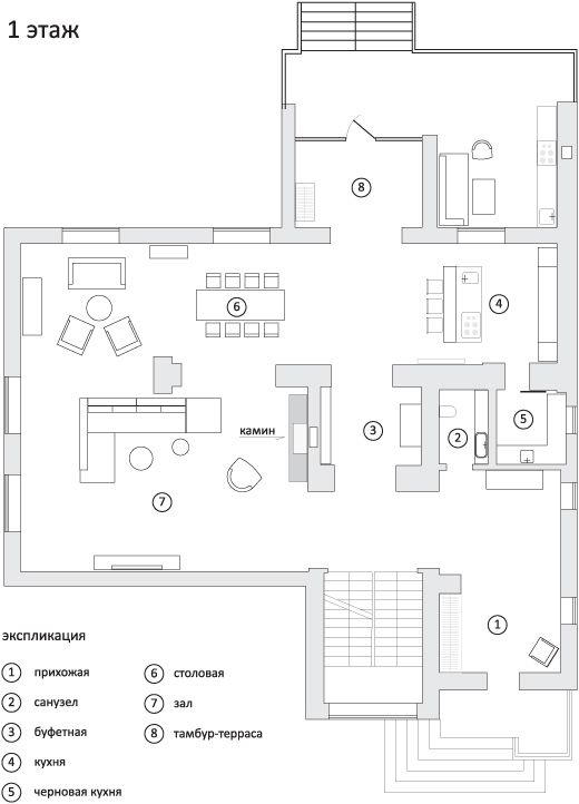 Камин расположен в зале на первом этаже. Поскольку он находится несколько сбоку, необходимо было создать каминную зону и перенести на нее акцент. Для этого зрительно расширили сам камин и придали ему весомости.