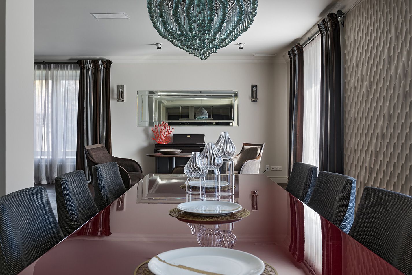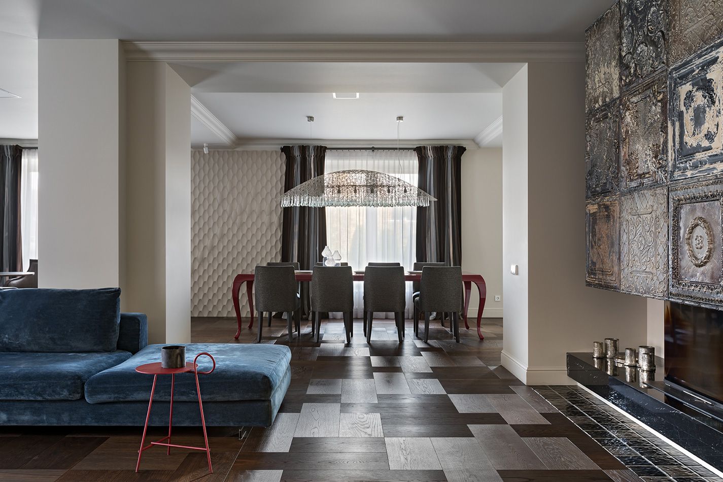 Камин расположен в зале на первом этаже. Поскольку он находится несколько сбоку, необходимо было создать каминную зону и перенести на нее акцент. Для этого зрительно расширили сам камин и придали ему весомости.