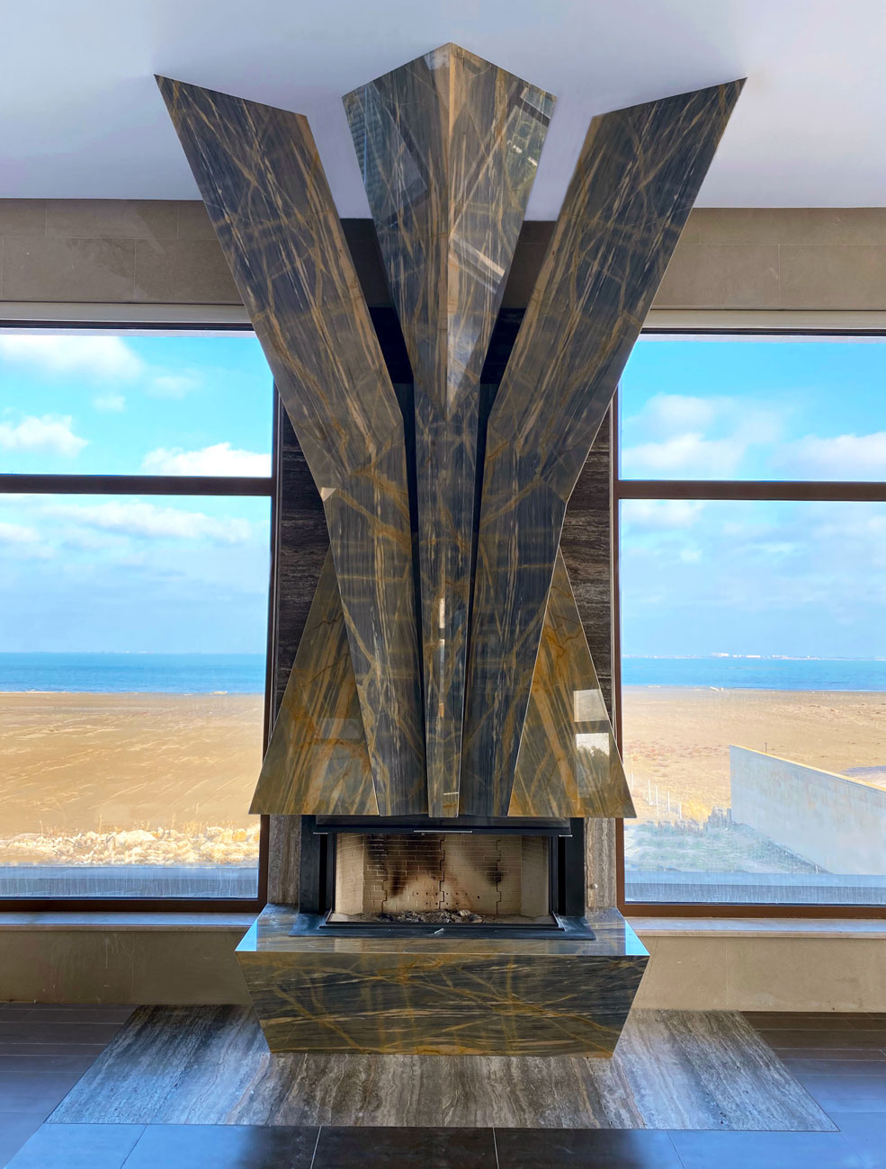 Камин установлен в доме, расположенном на побережье Каспийского моря в черте города Баку. Дом выполнен в современном стиле, с высокими потолками и большими витражными окнами. Камин расположен на втором этаже, в зале для приёма гостей. По задумке автора образ камина олицетворяет собой восход солнца, а именно его первые лучи, выныривающие из моря