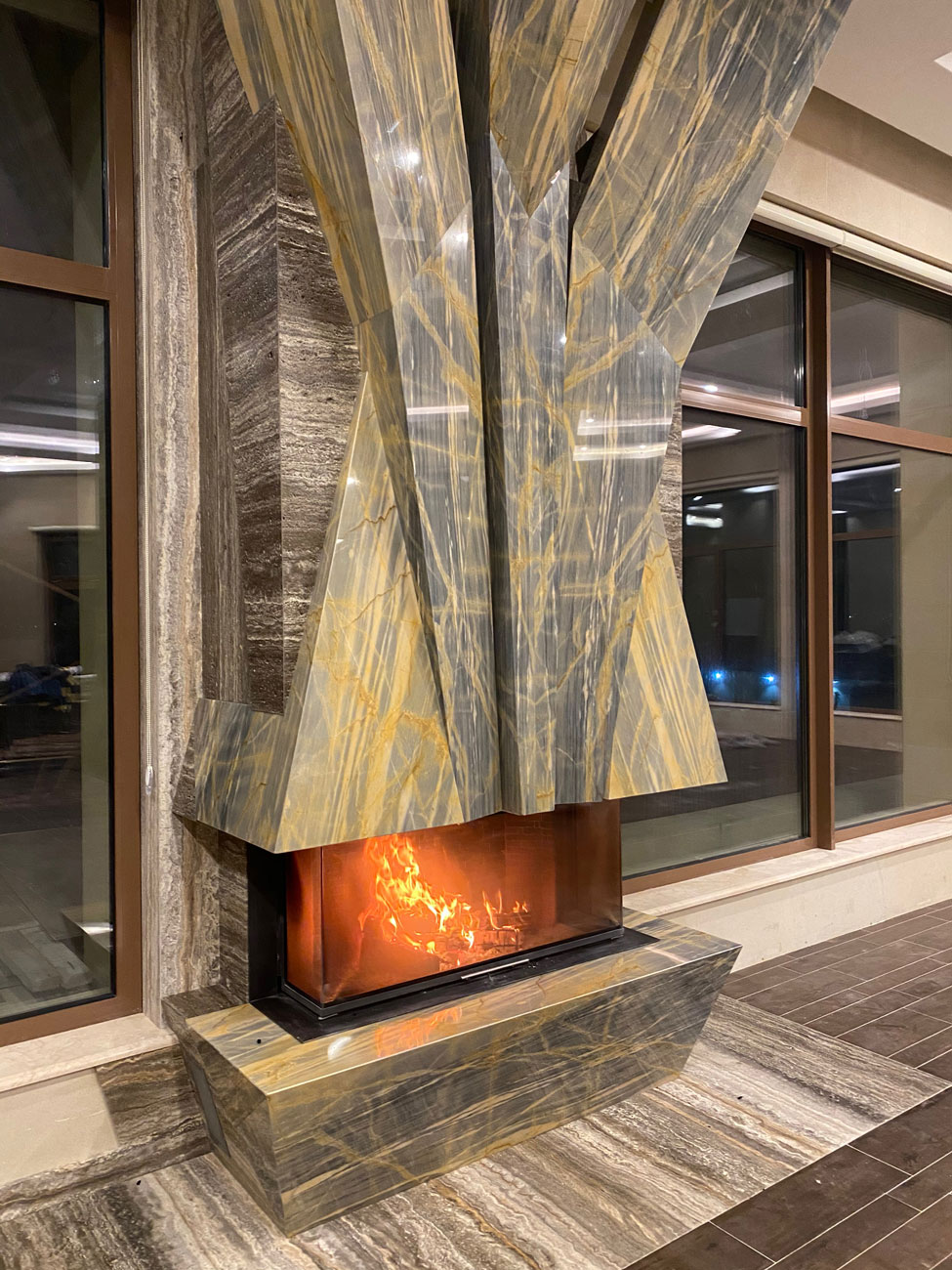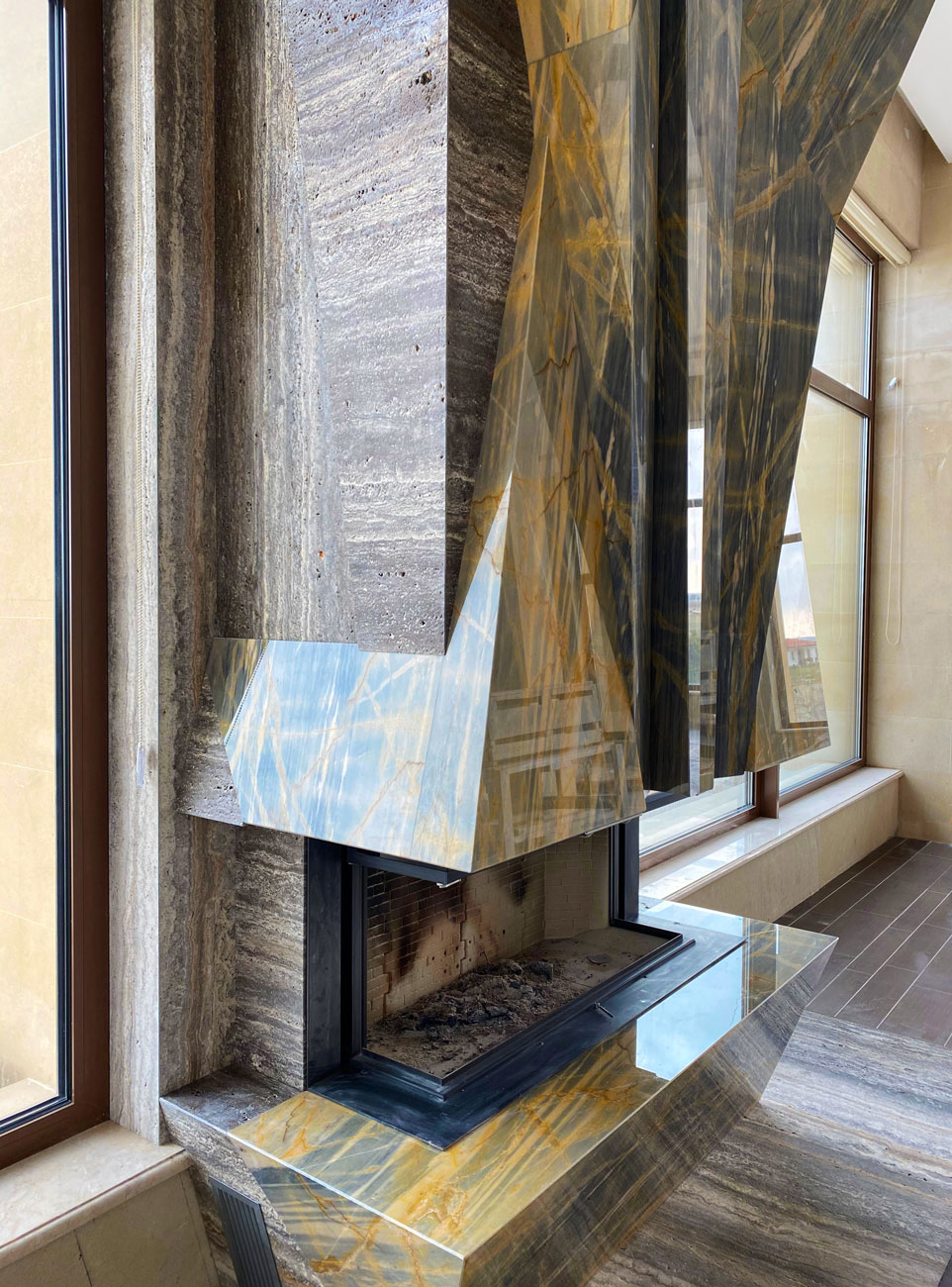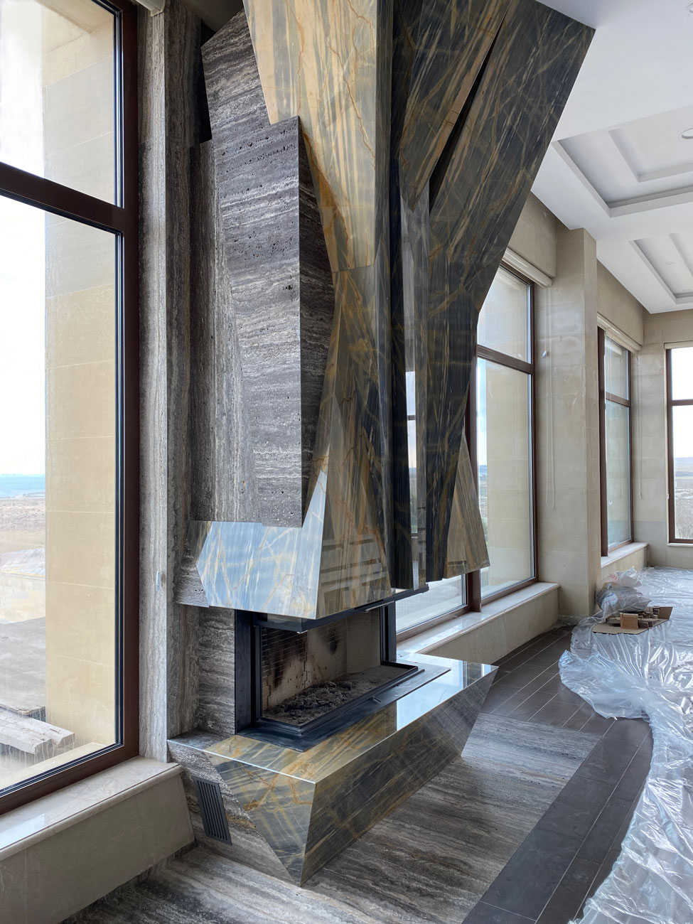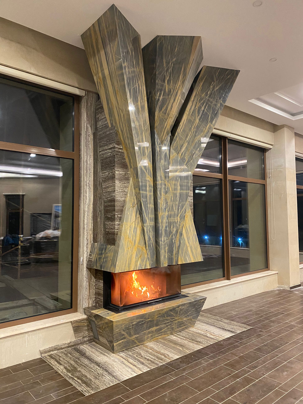 Высота камина 4500 мм, конструкция включает в себя короб из огнестойкого материала «Суперизол», металлокаркас, облицовка — мрамор и травертин. Все детали облицовки камина выполнены вручную (ручными инструментами).