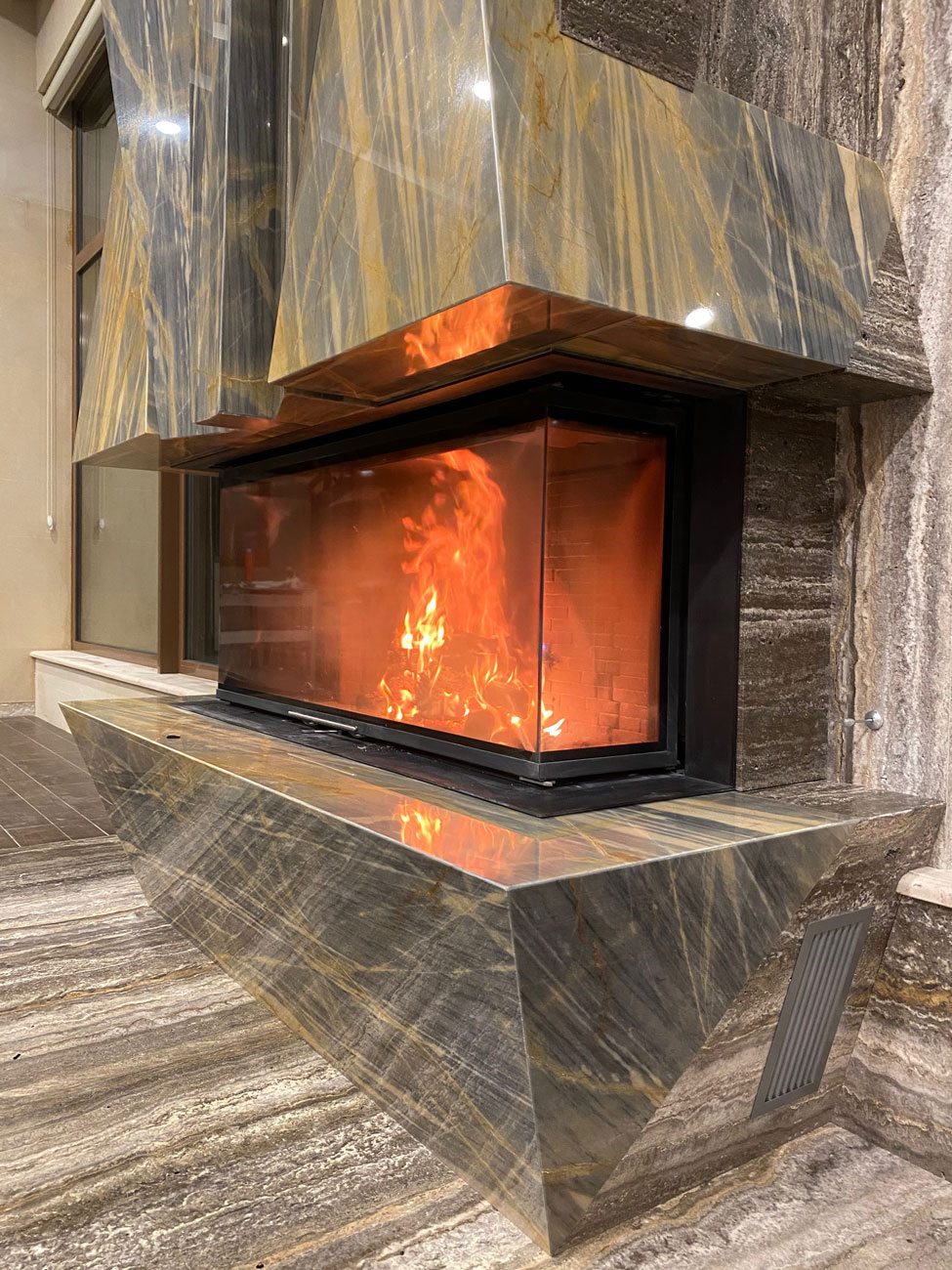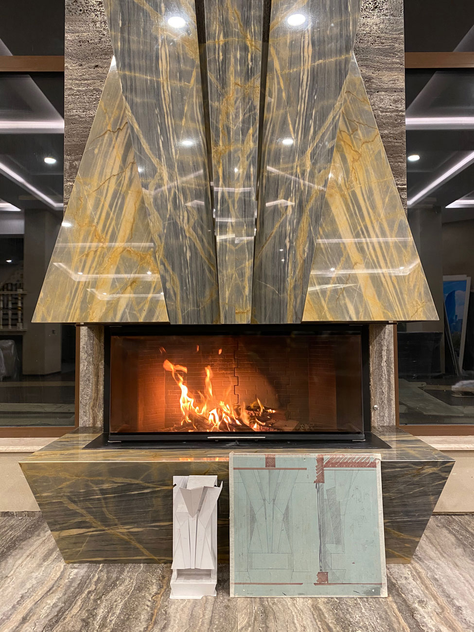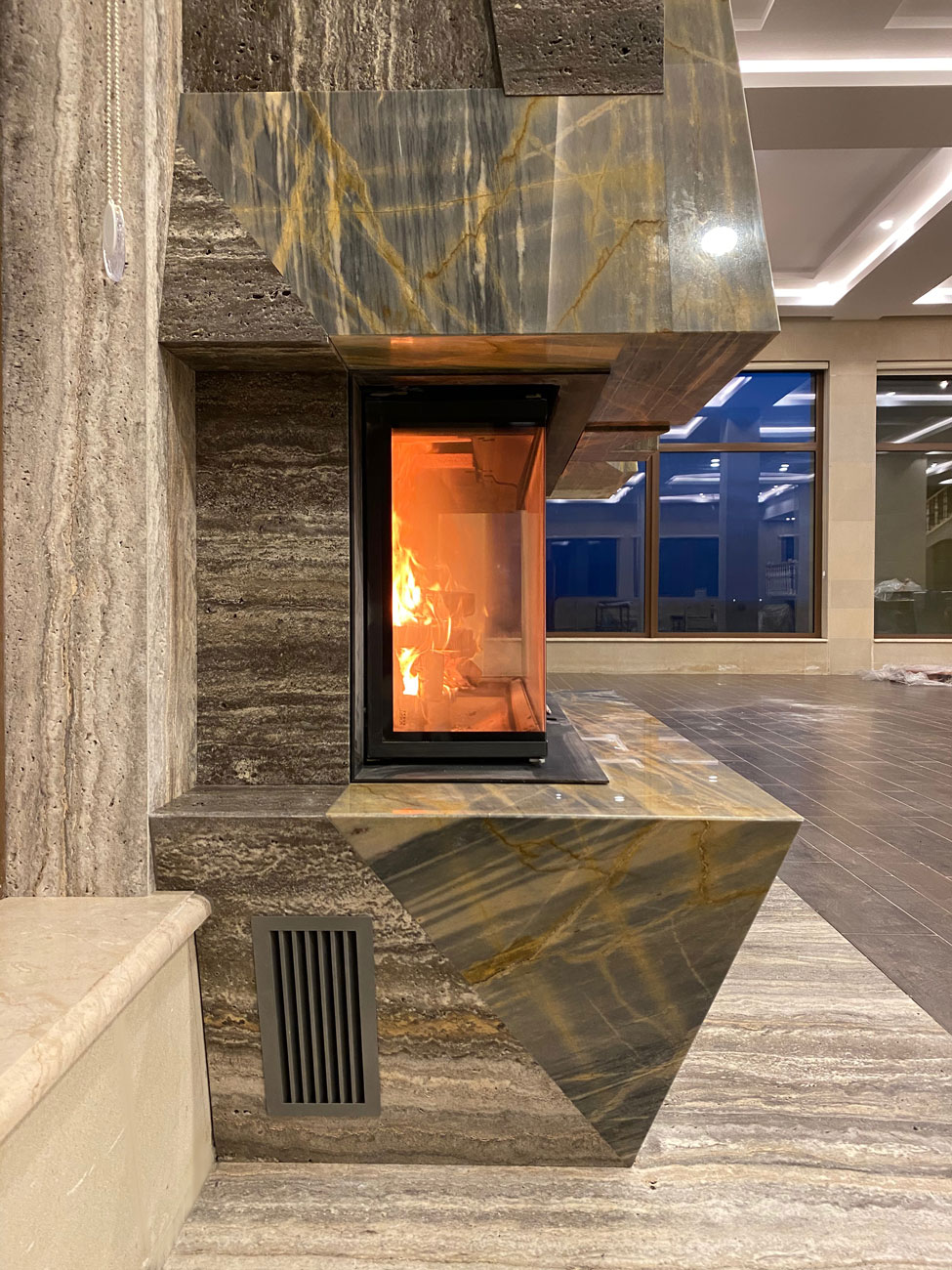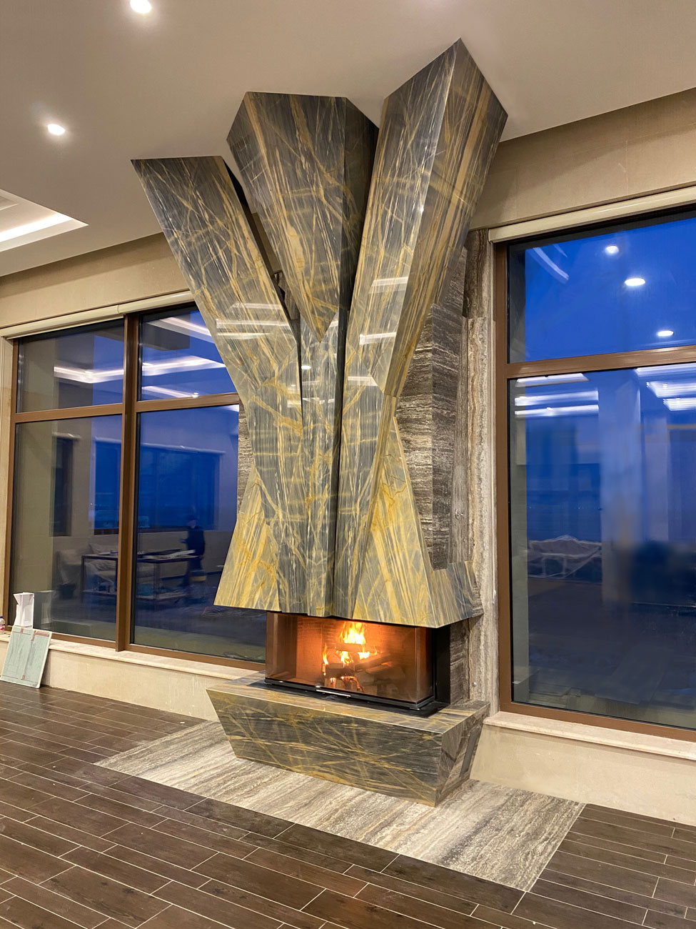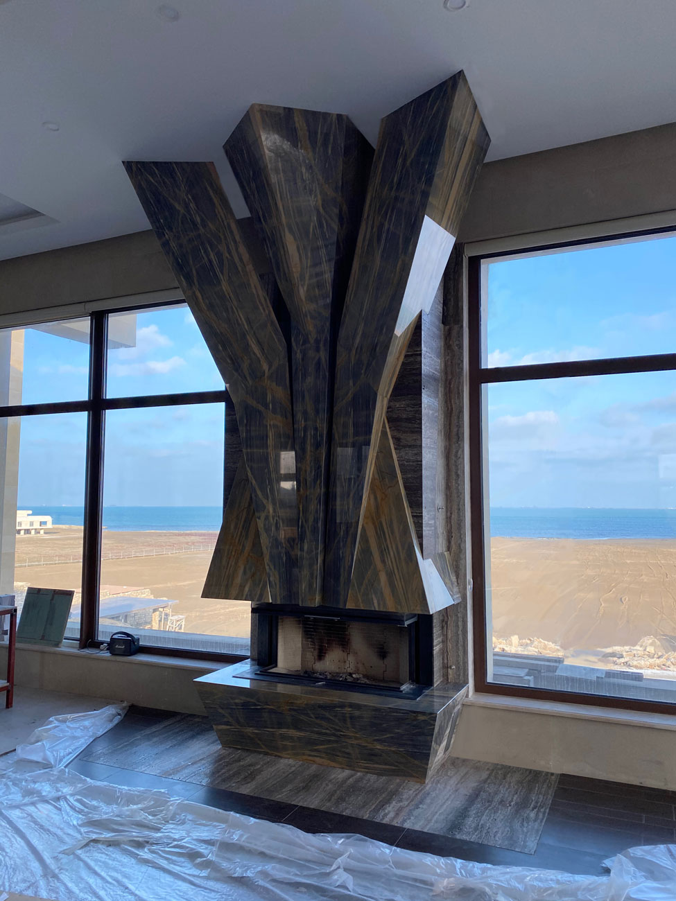 Высота камина 4500 мм, конструкция включает в себя короб из огнестойкого материала «Суперизол», металлокаркас, облицовка — мрамор и травертин. Все детали облицовки камина выполнены вручную (ручными инструментами).