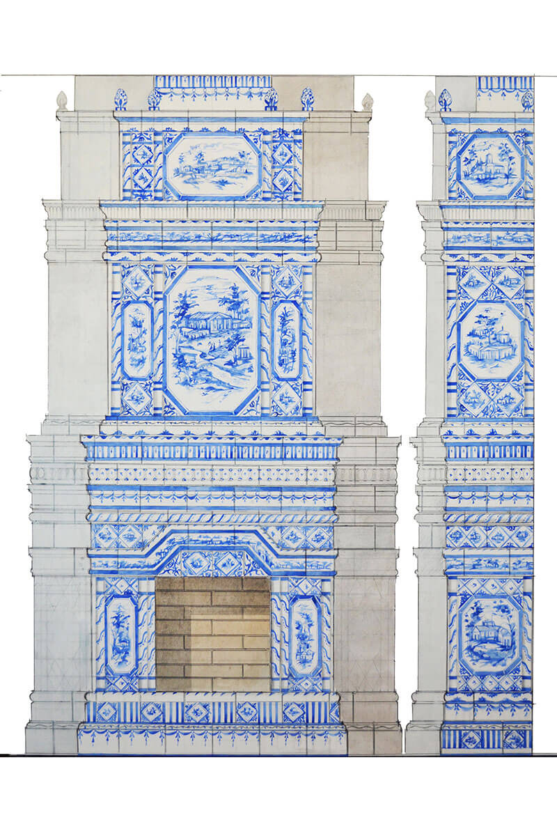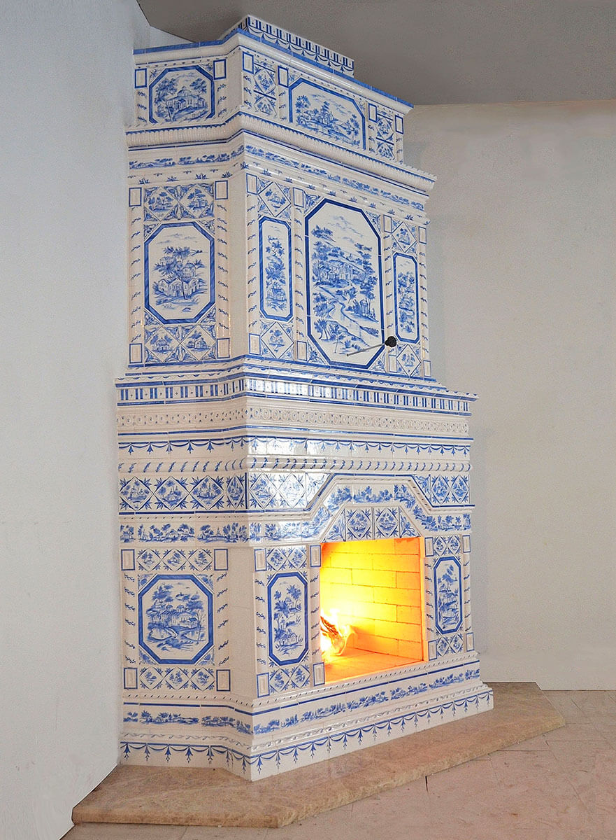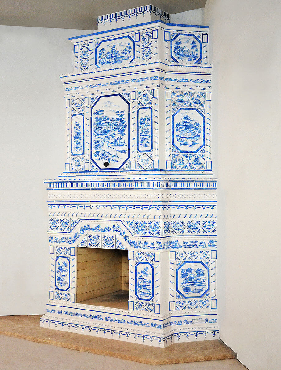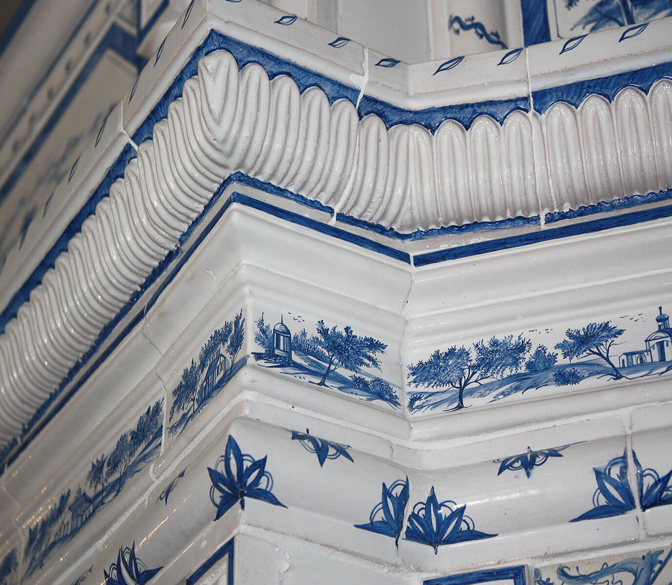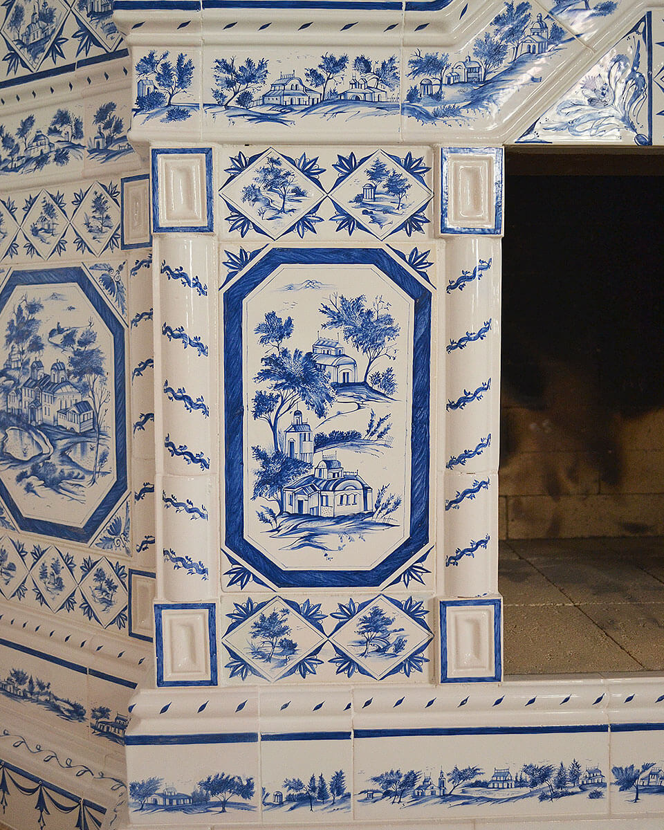 Камин напоминает небольшое архитектурное сооружение с четкими горизонтальными членениями, облицованный сюжетными изразцами с синей росписью по белому фону.