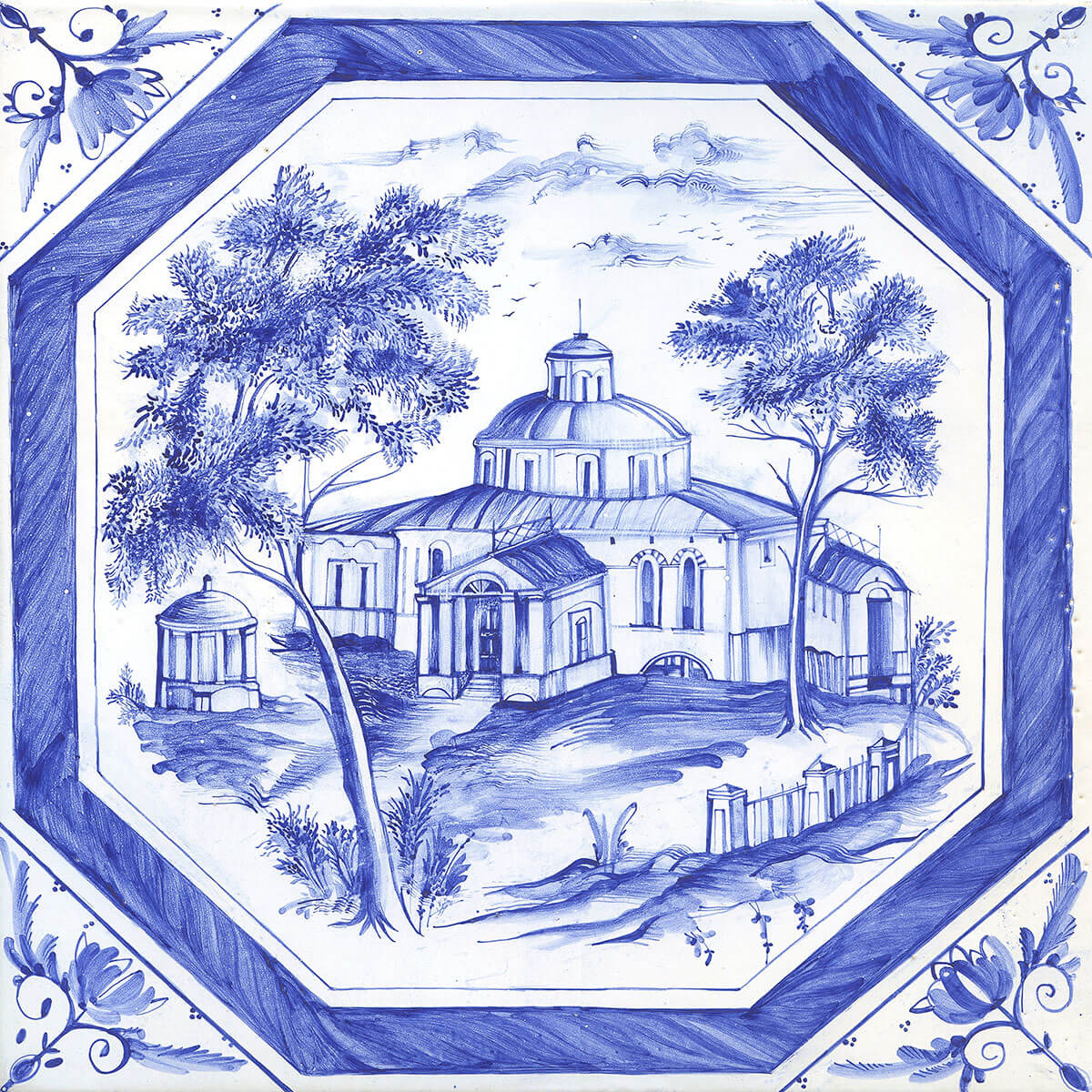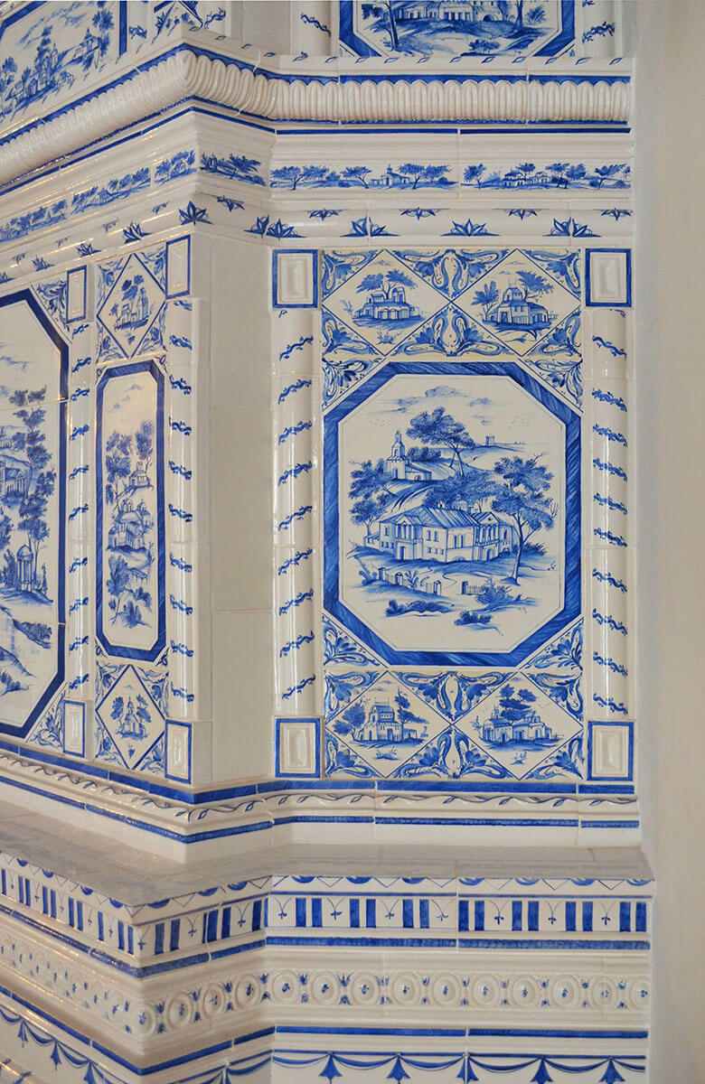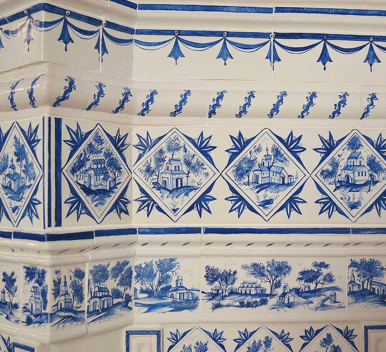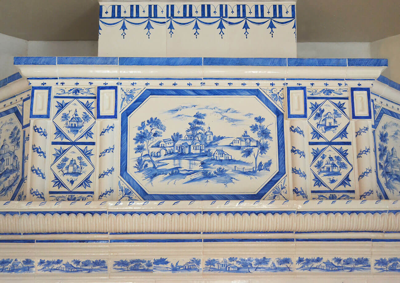 Расписные изразцы, как сюжетные, так и орнаментальные, некоторые сюжеты размещены на нескольких изразцах. Отдельные и более сложные — с крупной синей росписью, композиции которых составляют прообразы подмосковной усадьбы.