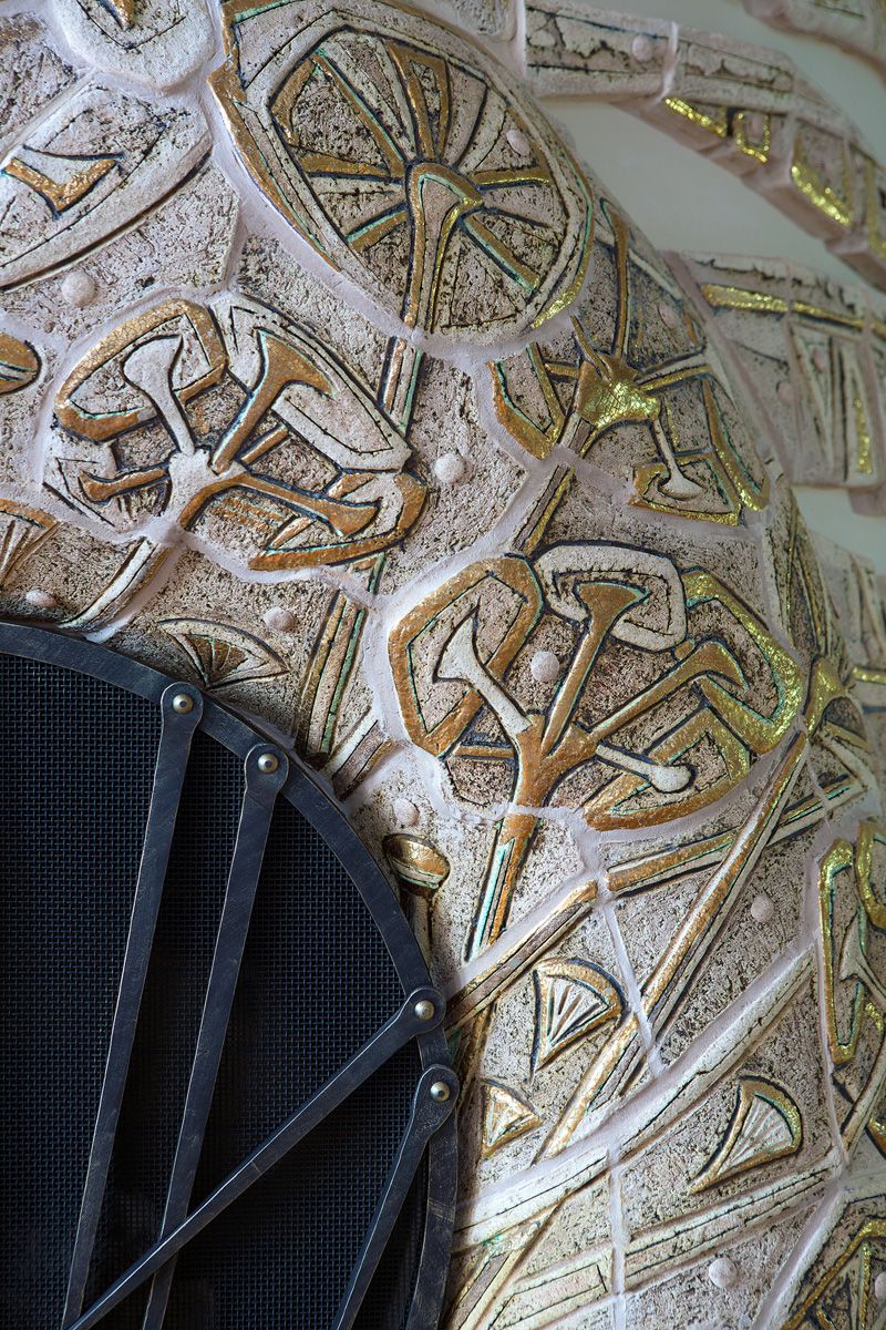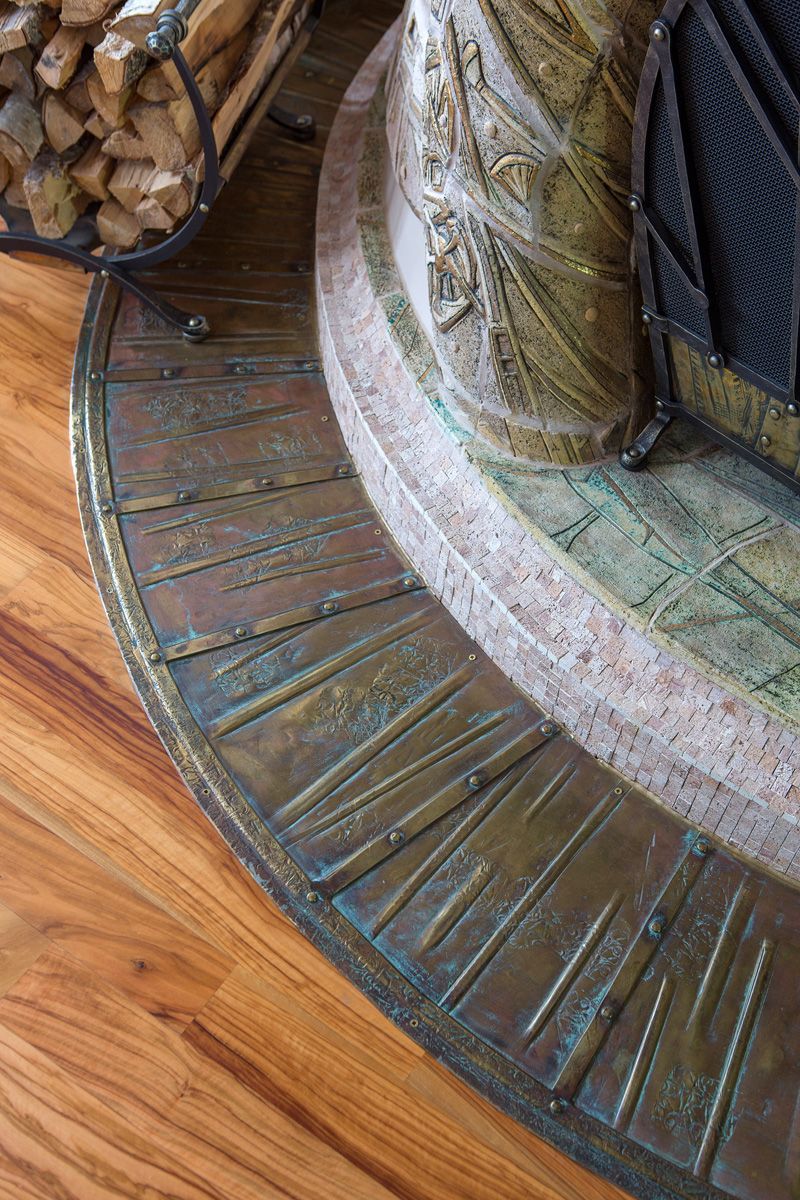 Защитный экран топки выполнен в едином стиле с камином и продолжает растительный узор. Стальные прутья имитируют стебли, а золотистые вставки подчеркивают и усиливают оттенки конструкции.