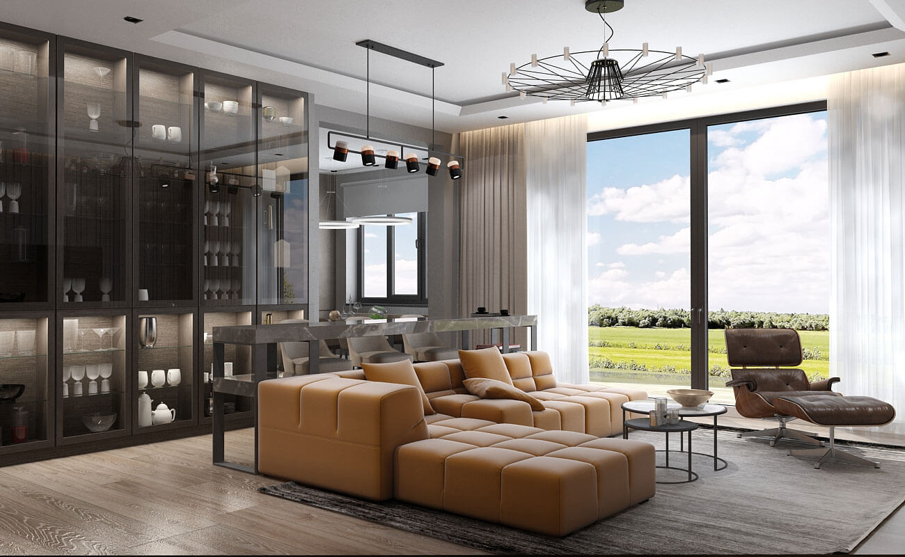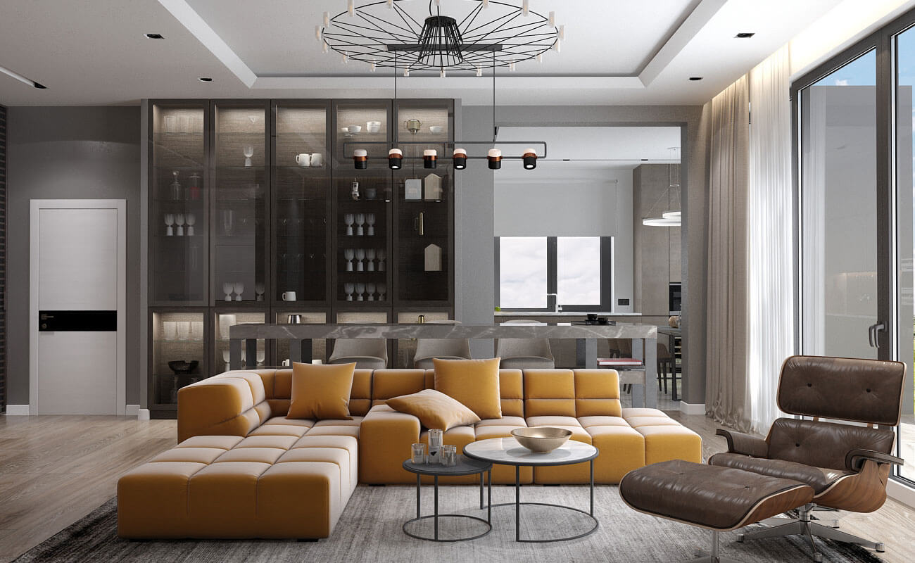 Акцентом гостиной является камин в стиле минимализм, яркий оранжевый диван — поддерживает тему огня в интерьере и делает его более цельным и стильным.