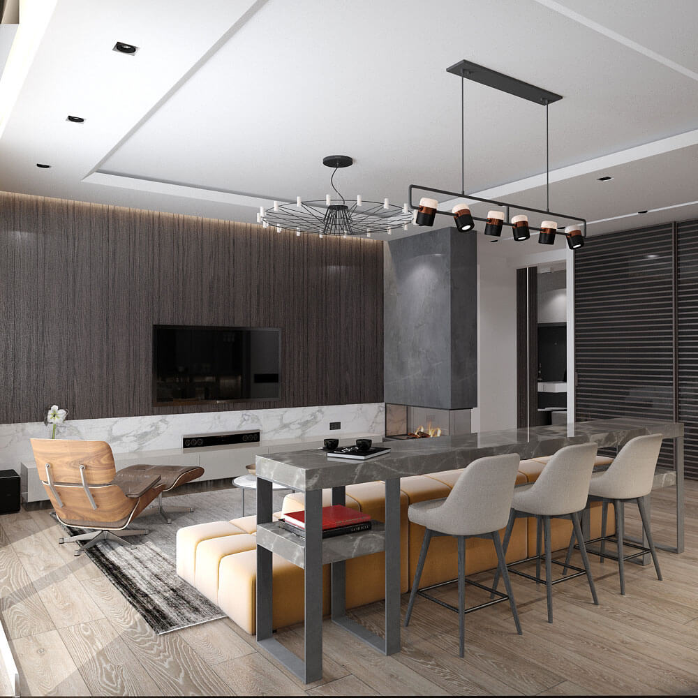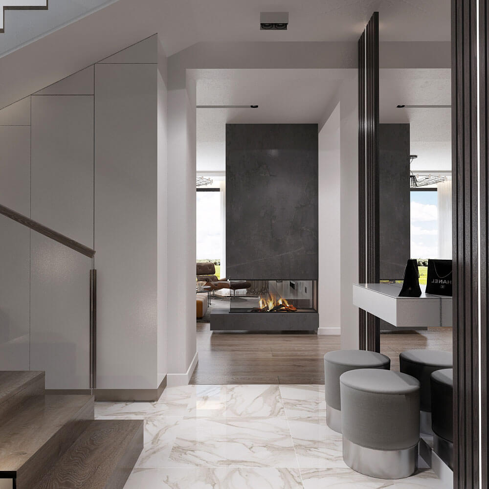 Камин в этом интерьере не только символ домашнего очага и элемент декора, но и источник тепла. Темно-серая керамогранитная отделка камина подчеркивает общую стилистику интерьера, эффектно выделяя пламенную топку на общем фоне стен.
