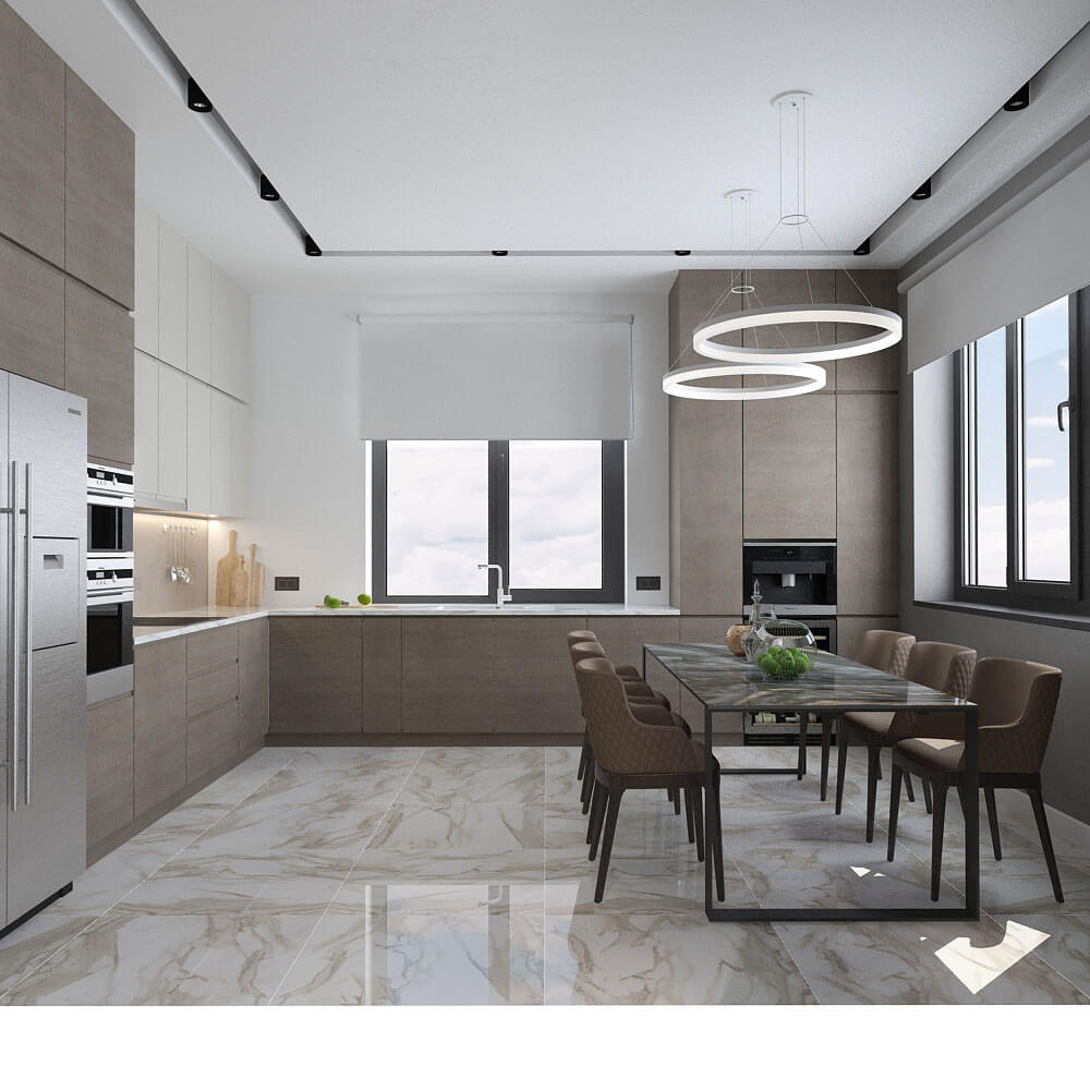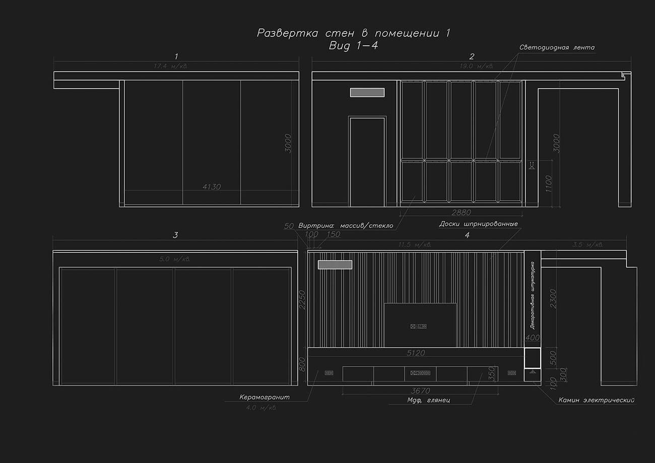 В отделке камина использован широкоформатный керамогранит.