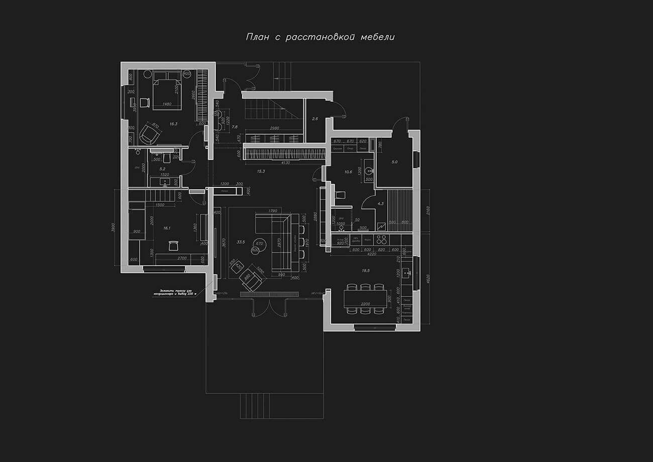 Проект частного дома выполнен в современном стиле в черно-серых тонах с акцентными яркими цветами. Преобладающий белый цвет зрительно расширяет пространство, темная мебель выбрана для создания контраста в интерьере.