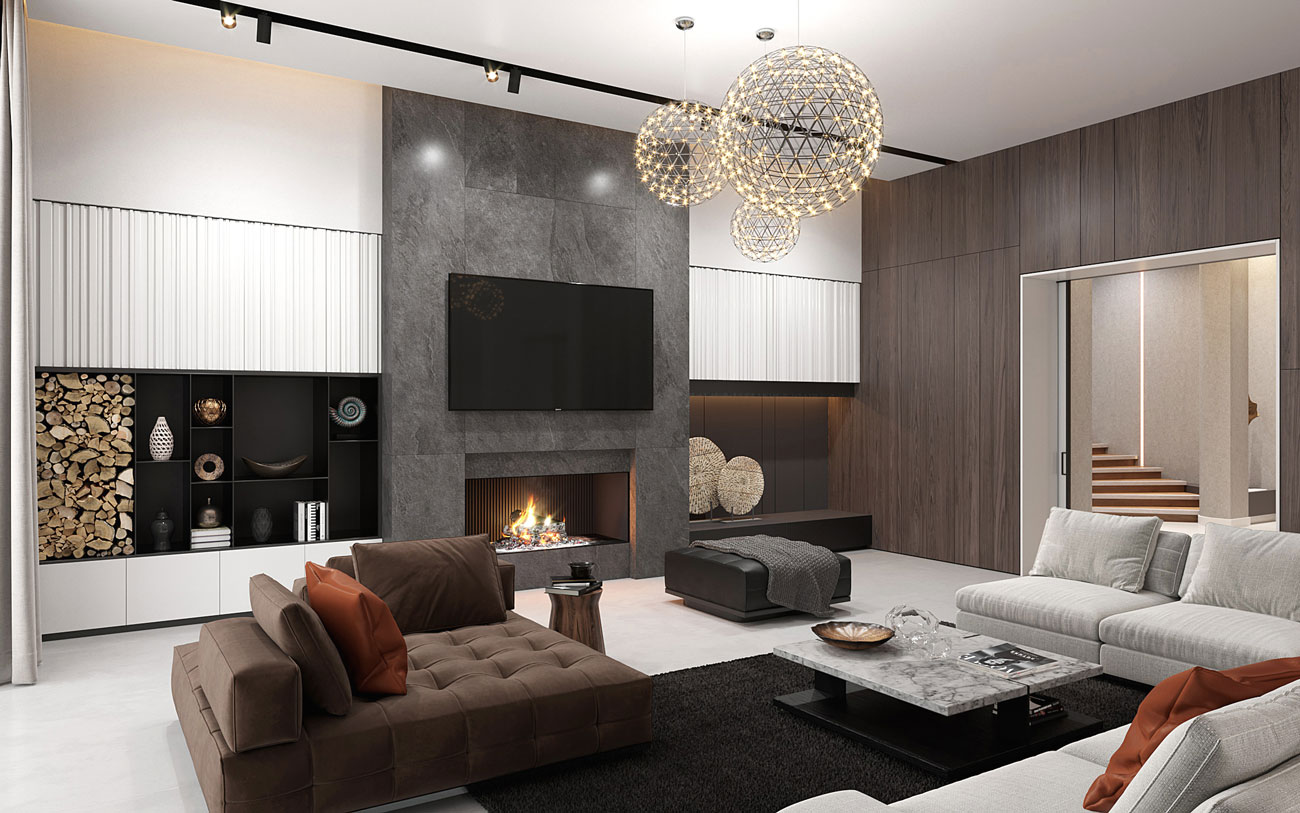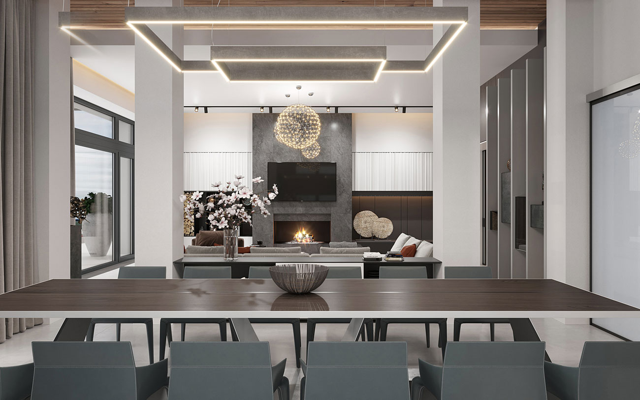 Камин расположен в загородном доме в помещении гостиной-столовой. Камин в равной степени делит сферу внимания с ТВ и размещен с ТВ на одной осевой линии, но на разной высоте. Для того, чтобы усложнить пространство, слева и справа от зоны камина-ТВ элементы мебели выполнены по-разному.
