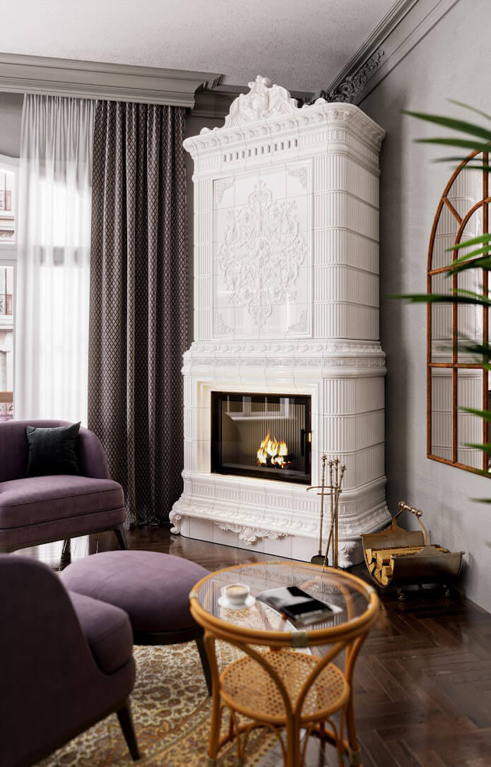 Все элементы этого камина выдержаны в строгом классическом стиле. Мягкие изгибы угловых элементов и строгая полоска лежит в основании данного конструктива. Всю строгость и сдержанность этого камина разбавляет изящное орнаментальное панно, которое занимает его центральную часть. Белый глянцевый цвет подчеркивает торжественность и чистоту и создает в интерьере атмосферу достатка и благополучия. Этот камин является воплощением уюта и элегантности, и создаст атмосферу тепла и комфорта в любом доме.