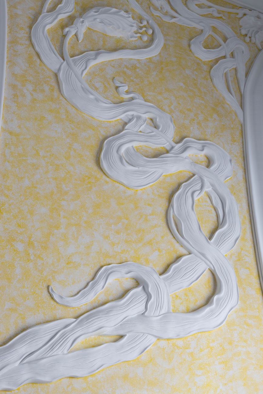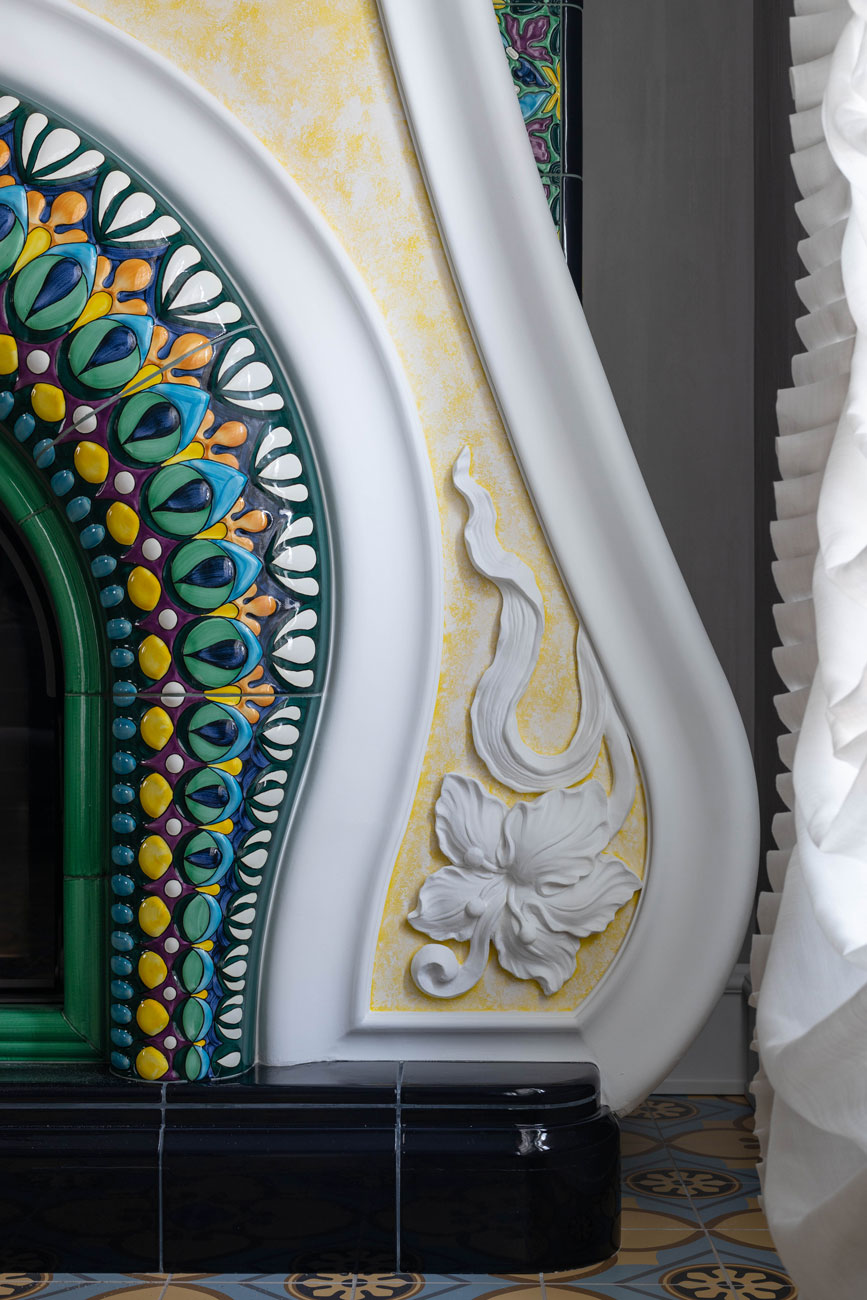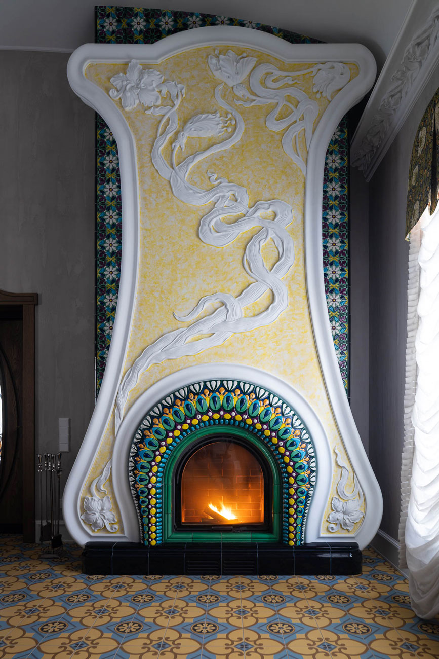 Этот камин расположен в гостиной дома в Пушкинском районе Санкт-Петербурга. В его форме преобладают изогнутые линии, продиктованные стилистикой ар-нуво. Главным декоративным украшением камина является массивная керамическая арка индивидуального изготовления.
