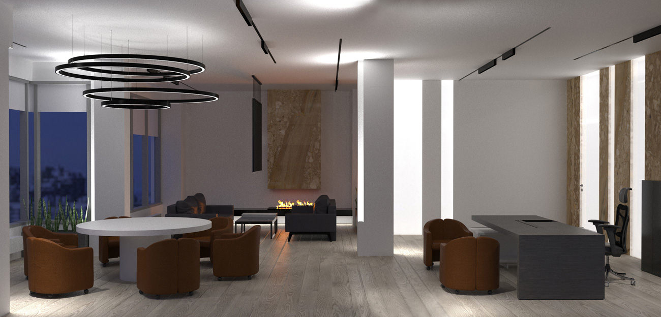 Камин вместе с диванами и журнальным столиком организовал лаунж зону для переговоров и решил поставленную заказчиком задачу. По проекту очаг будет подключен к водопроводу.