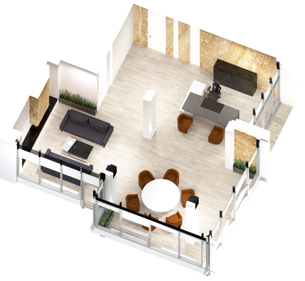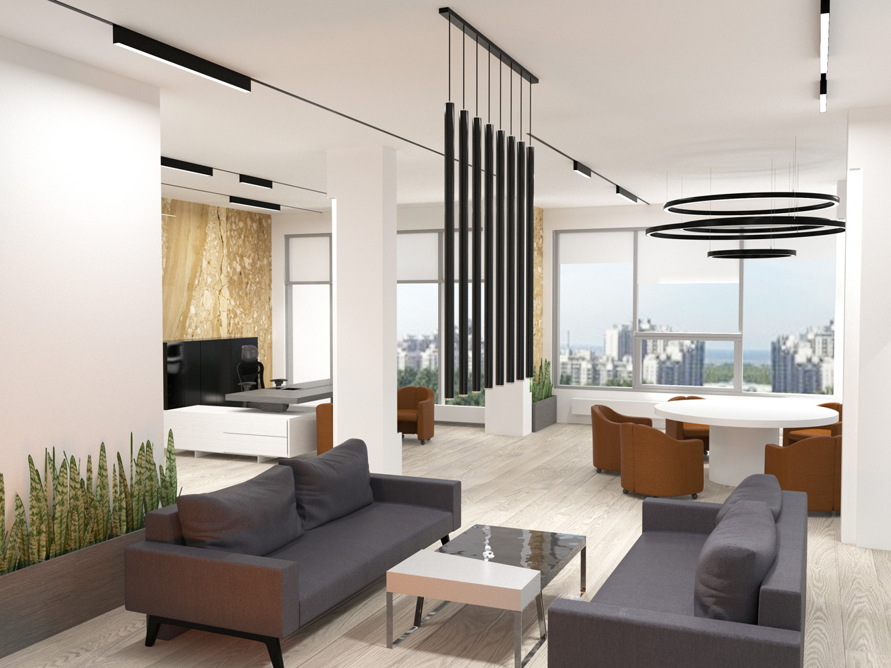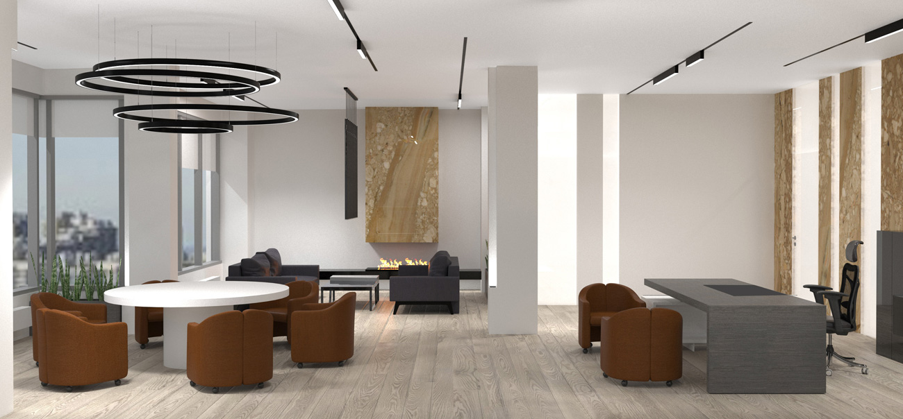 Так как рабочий офис крупной компании находится за городом, заказчик поставил задачу создать представительский офис с лаунж зоной для переговоров в центре города.