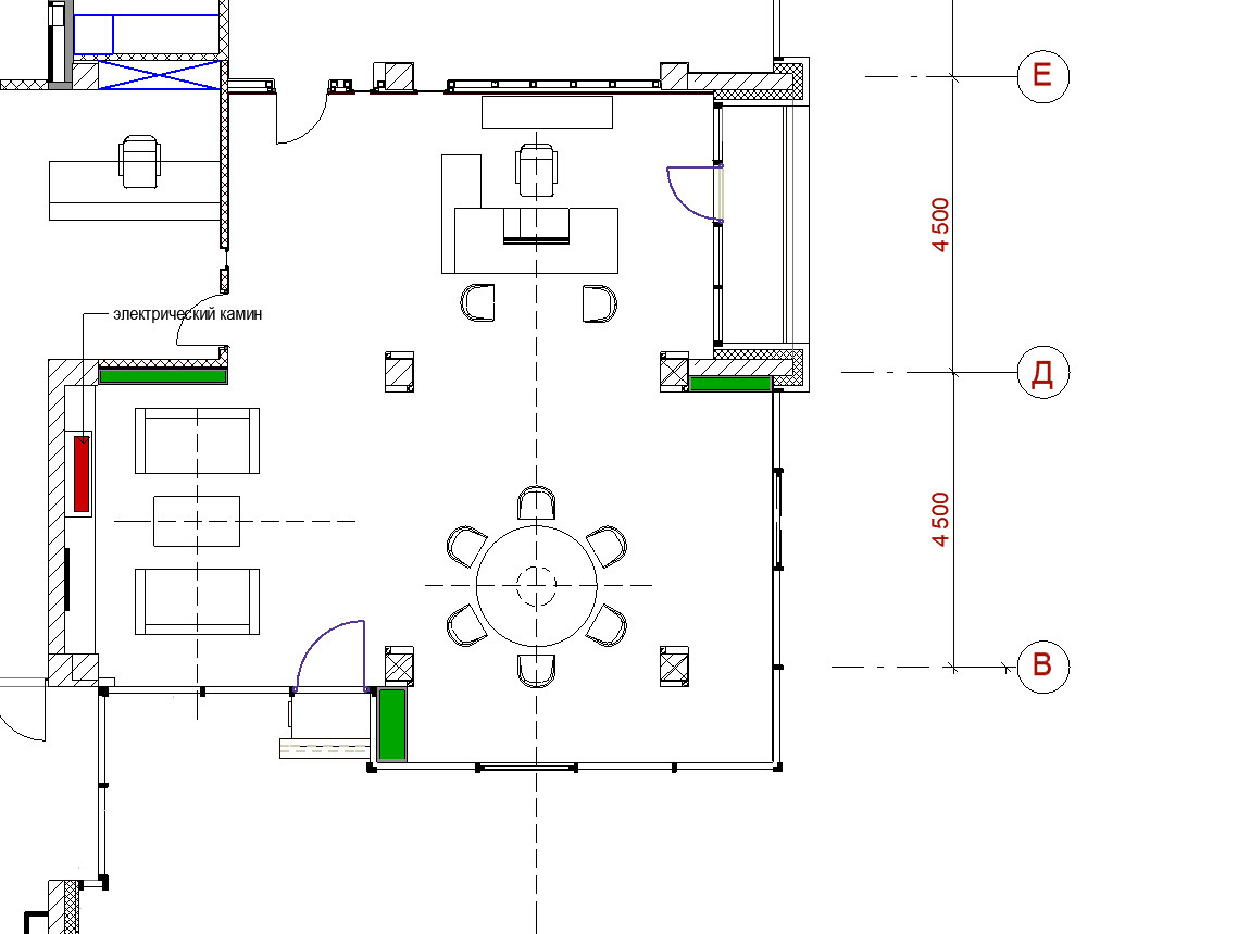 Центральное место этой зоны занял электрический очаг Dimplex Opti-Myst Cassete 1000 PS. Портал для него решен в стиле минимализм и облицован слэбами натурального мрамора Daino Reale.