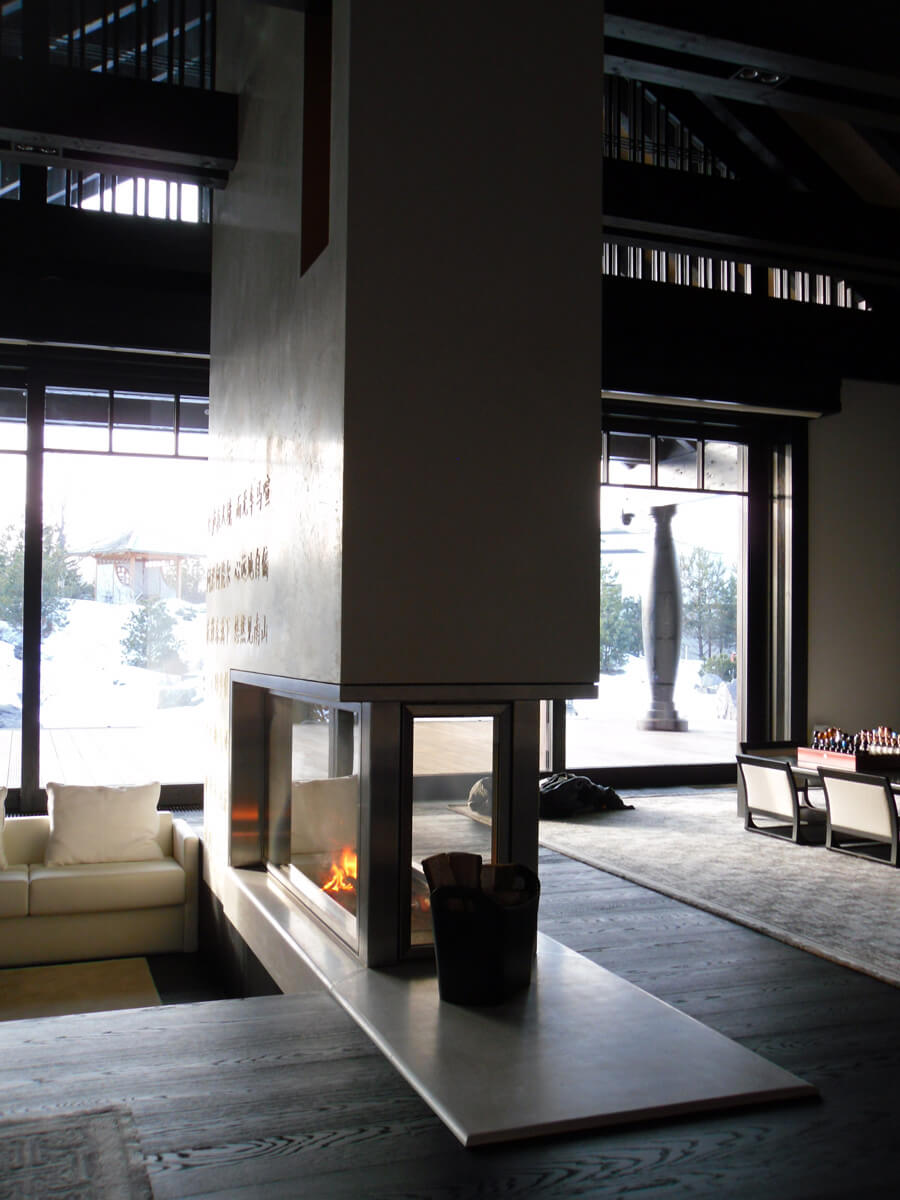 Топка главного камина утоплена в конструкцию пола. Под топки камина находится на одной отметке с отметкой чистого пола. Такое решение зрительно объединяет помещение Конструктивно короб камина из панелей силиката кальция производства Silka и проходящие через корпус дымоходы, подвешены к металлокаркасу из профильных труб 100 х 50 мм.