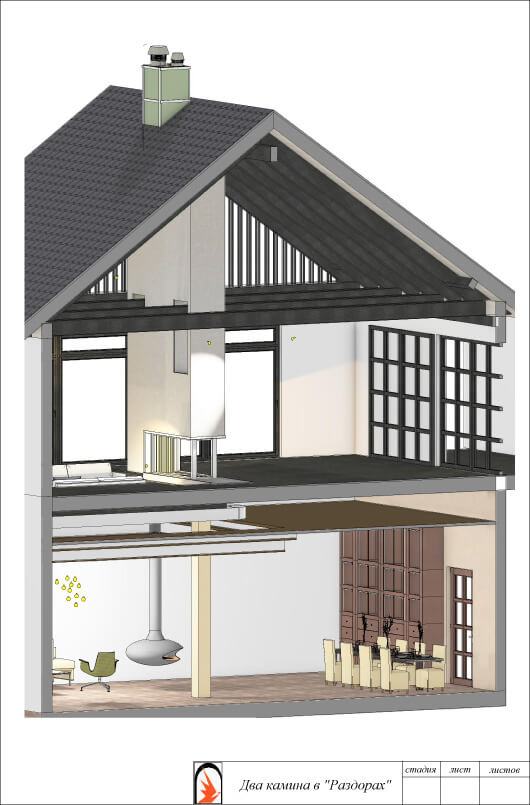 Дымовая труба от открытого камина в цокольном этаже проходит через объем расположенного над ним камина в главном помещении.
