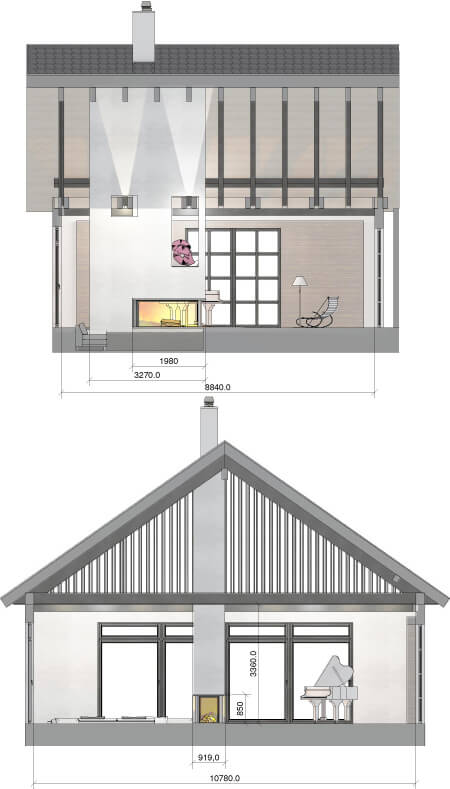 Камин и дымоход по требованию генпроектировщика нигде не опираются на конструктивные элементы дома. Короб камина и дымоходная шахта консольно закреплены над топкой. В качестве несущего конструктивного элемента применена пространственная ферма, спрятанная в облицовке короба камина.