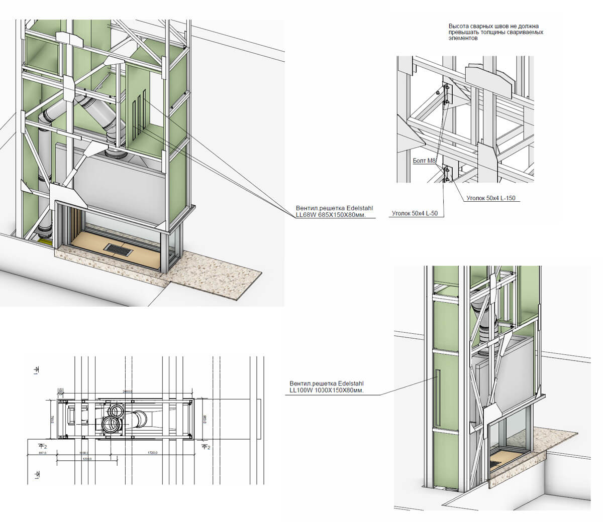 Каркас является самонесущим, крепится к цокольному бетонному перекрытию и не передает нагрузку на деревянные балки, через которые проходит короб.