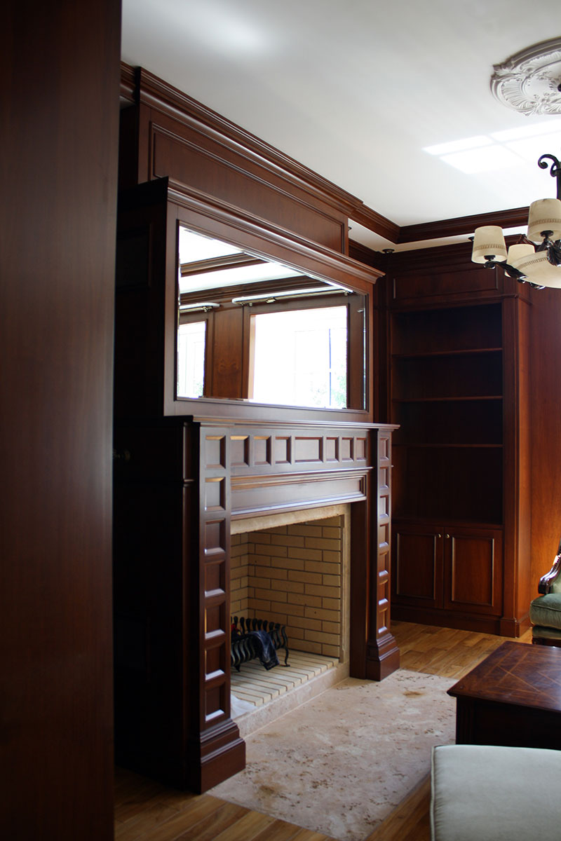 Все интерьеры отделывались панелями буазери, натуральным камнем, текстильными обоями и фактурными красками. Особая любовь заказчика к дровяным каминам выразилась в том, что на каждом этаже были спроектированы камины с различной отделкой. Они придают интерьерам незабываемый колорит, каждый из них по-своему уникален.
