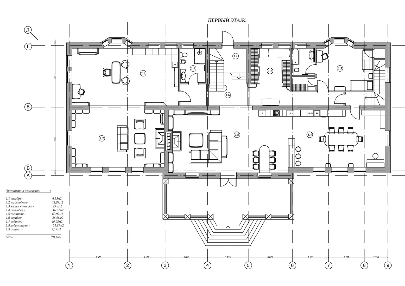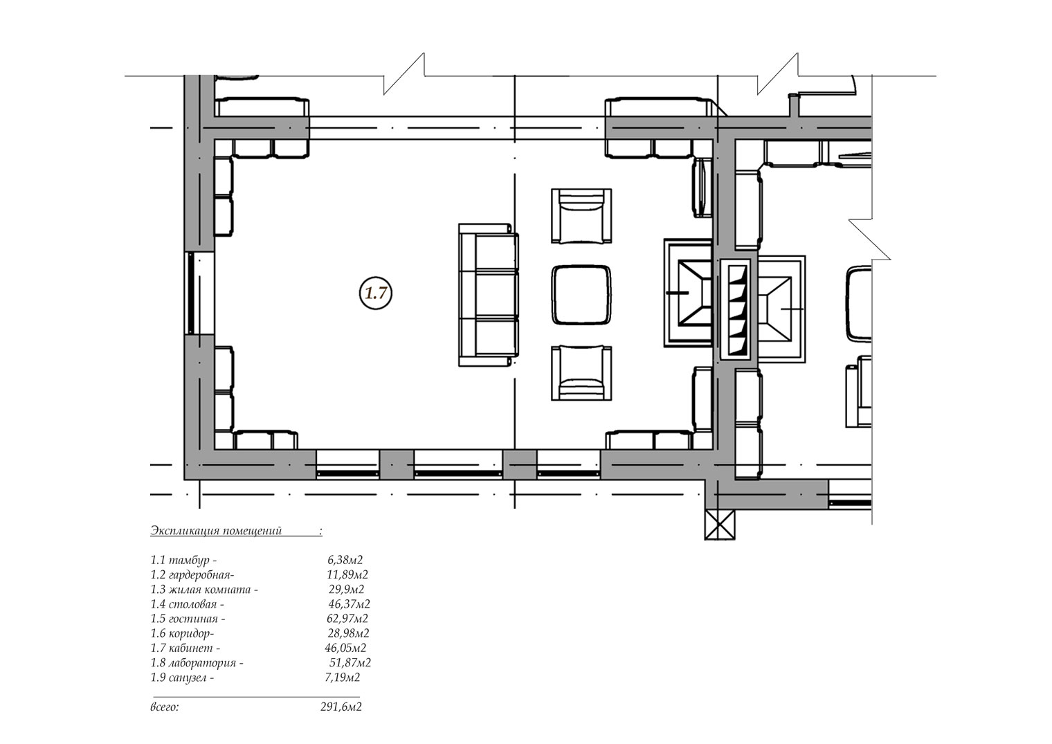 Камин расположен в загородном доме площадью 630 кв.м. На первом этаже представлена общественная зона: приемная, гостиная, столовая и кухня.