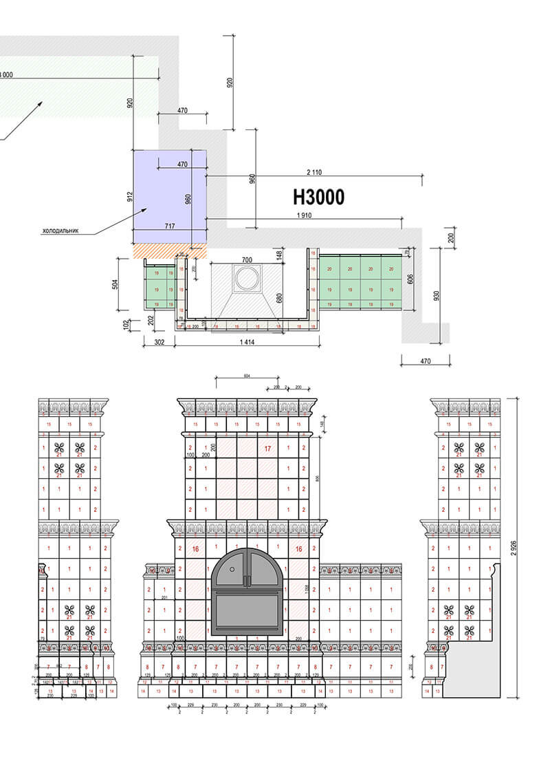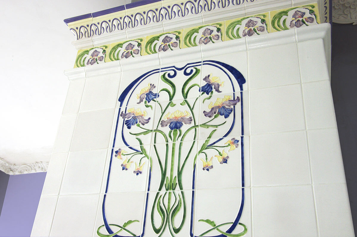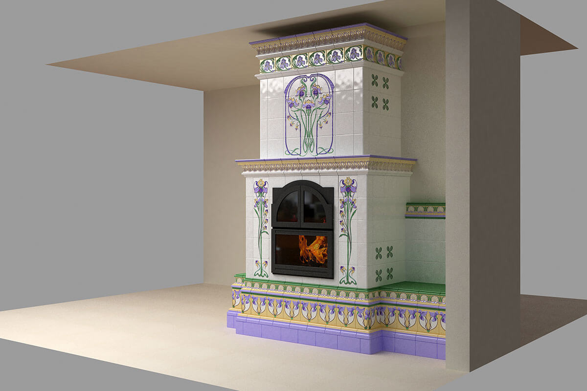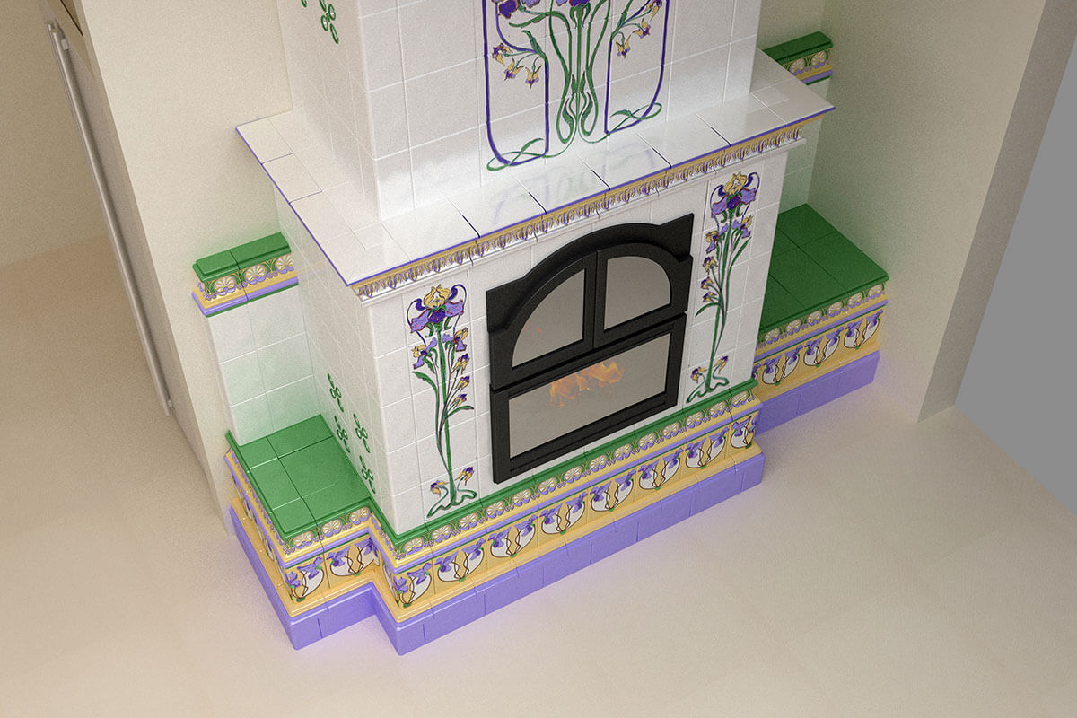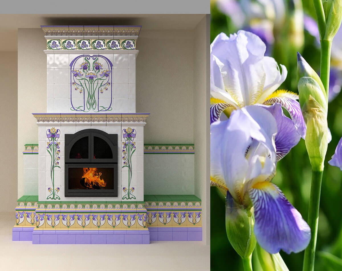 На центральном панно и на панелях по бокам от топки изображены ирисы, которые так любит заказчица. Сперва рельефы были нарисованы на бумаге, затем сделаны пробы цвета, а после изготовлены рельеф на производстве.