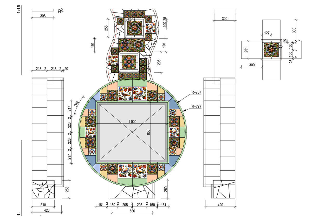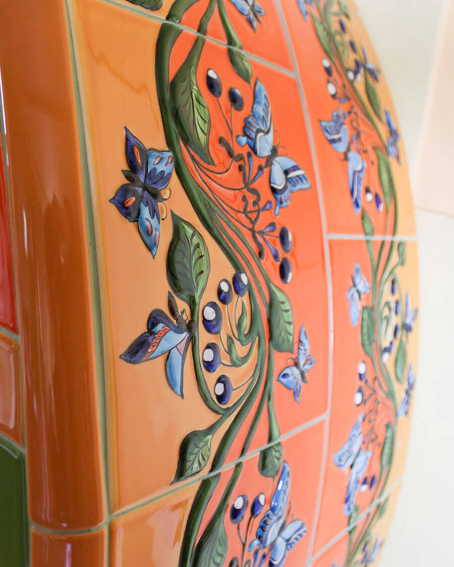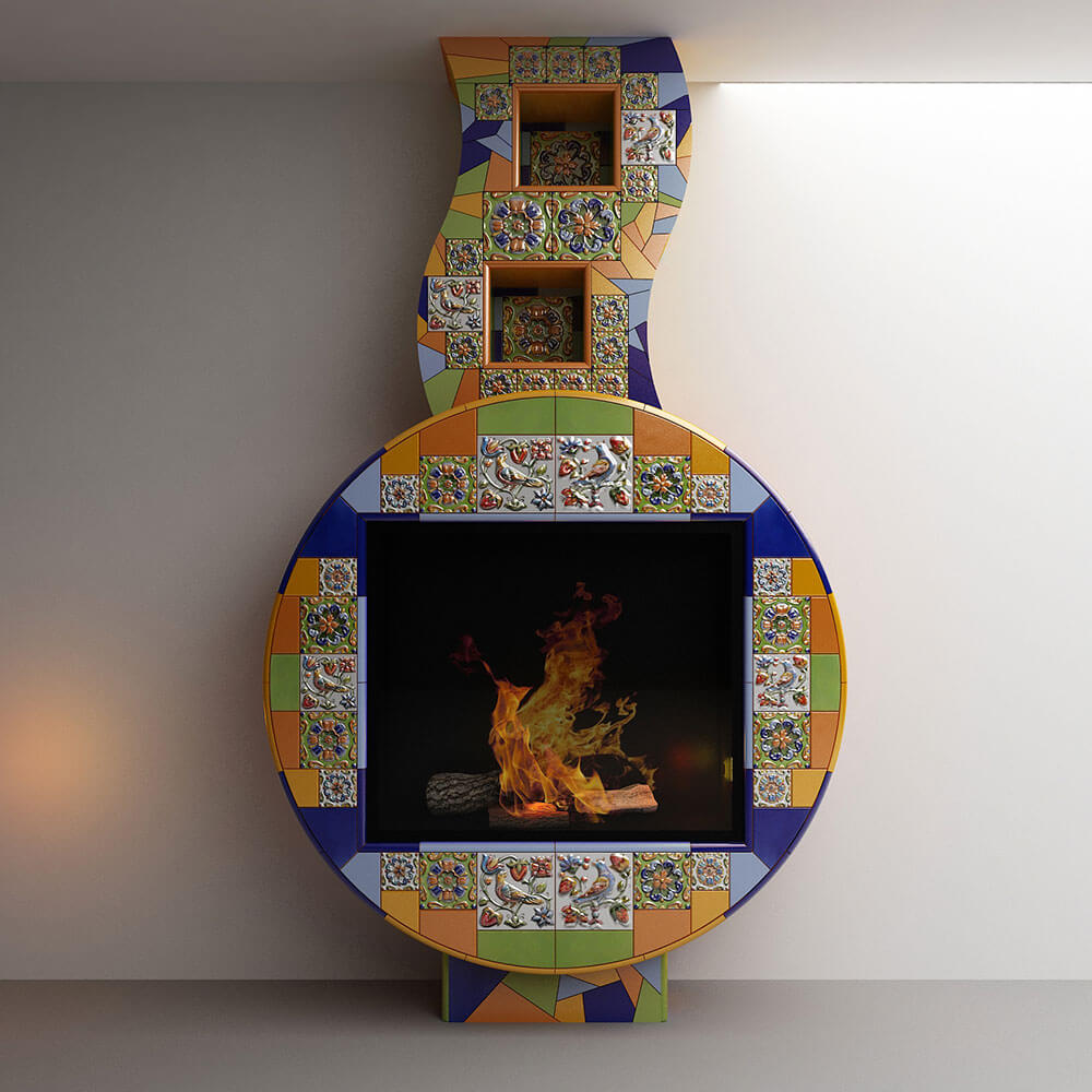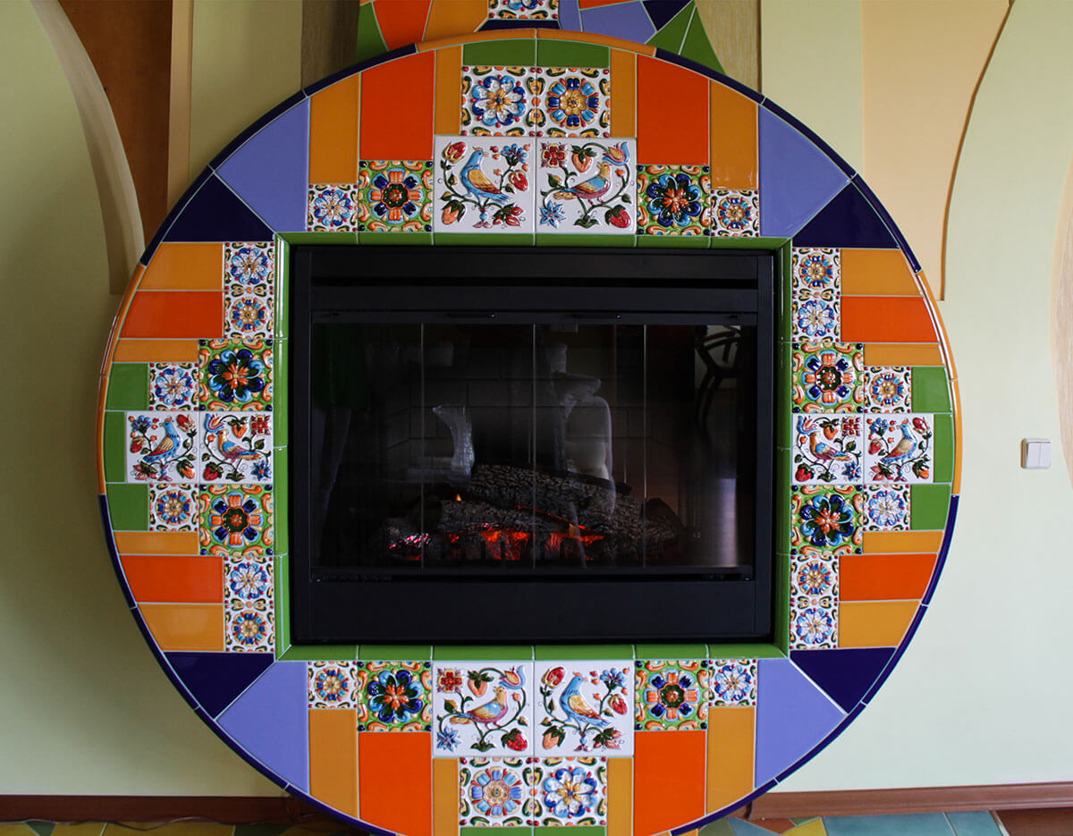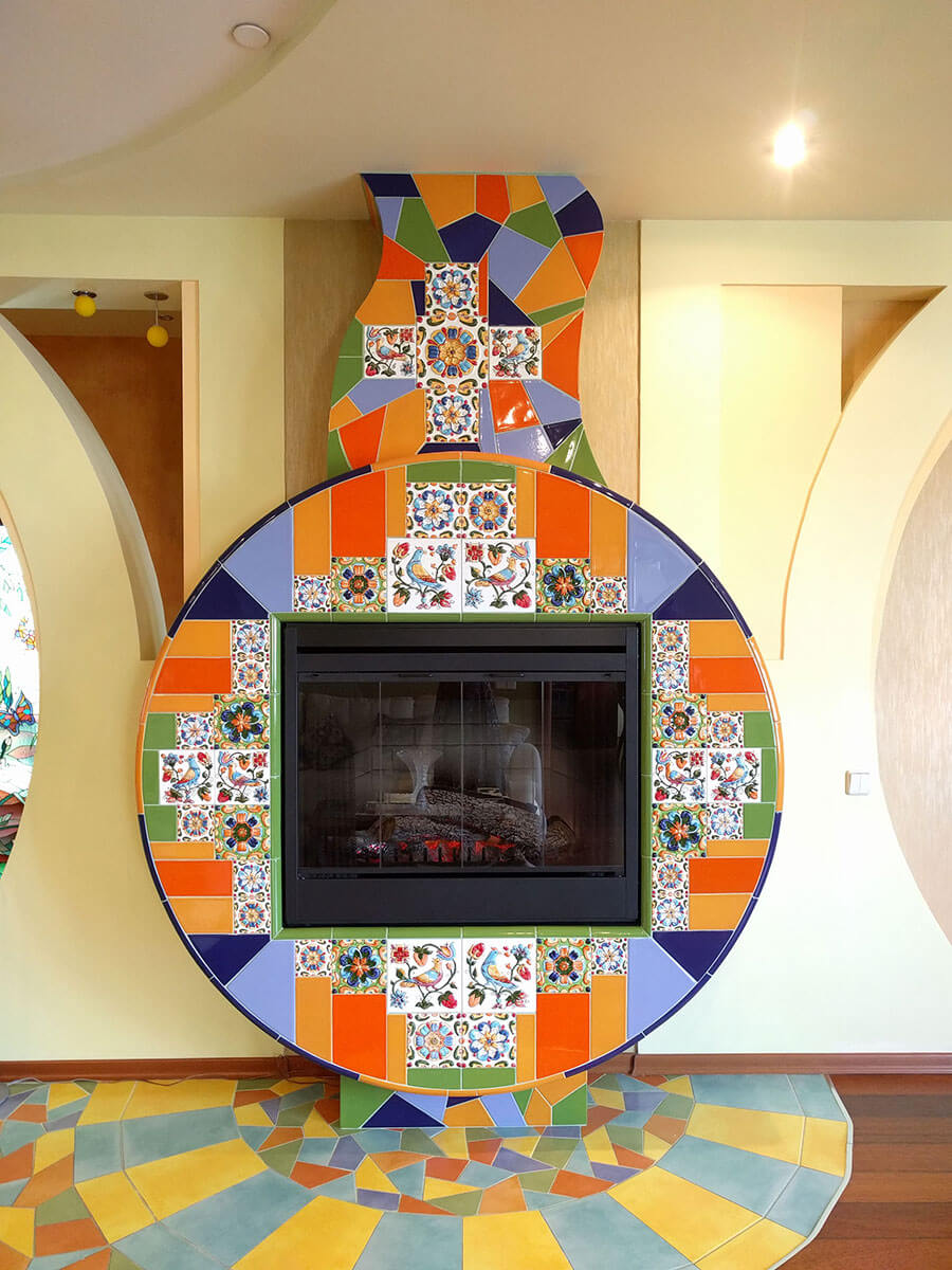 Однажды ко мне пришла заказчица, влюбленная в интерьер своей квартиры. Оформление было построено на причудливой смеси испанского ар нуво с элементами русского стиля. Единственное, что совершенно не вписывалось в сложившийся стиль — это камин, выполненный под штукатурку. Мы сразу решили, что должны сделать сделать его уникальным и совместить в нем все самые смелые идеи. Я предложила сочетать рельефные изразцы с орнаментом русского стиля с яркой плиткой в технике тренкадис. Трубу мы изогнули, чтобы добавить динамики, на боковых поверхность круга разместили бабочек, которых так любит заказчица.