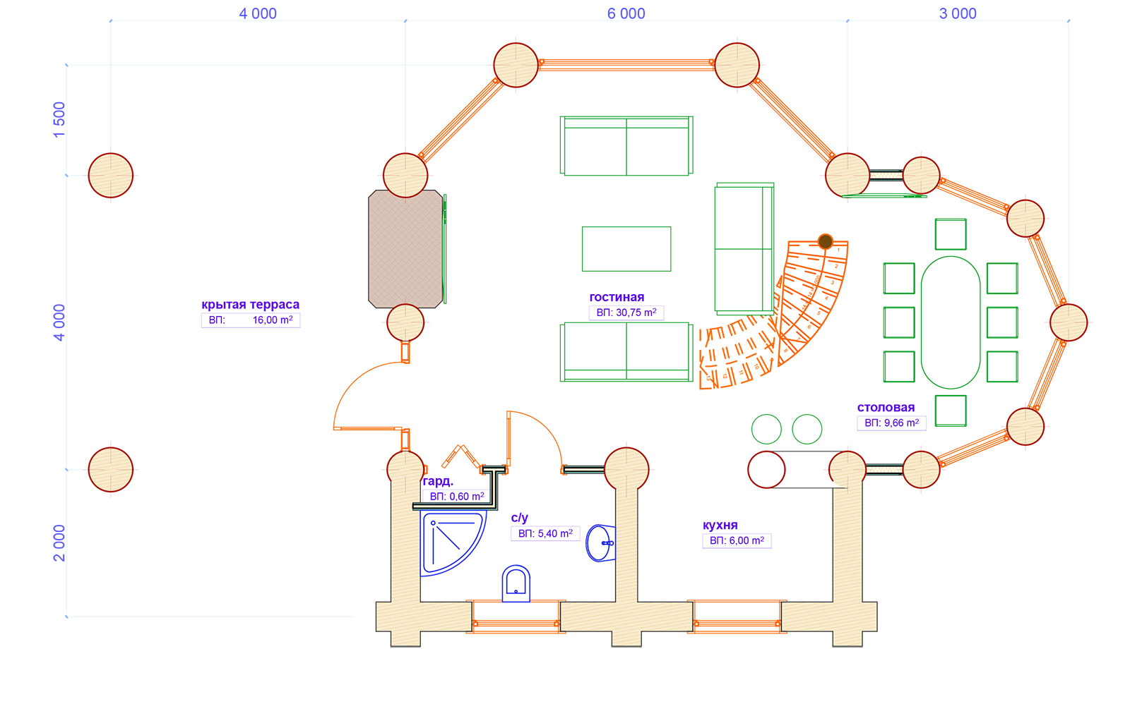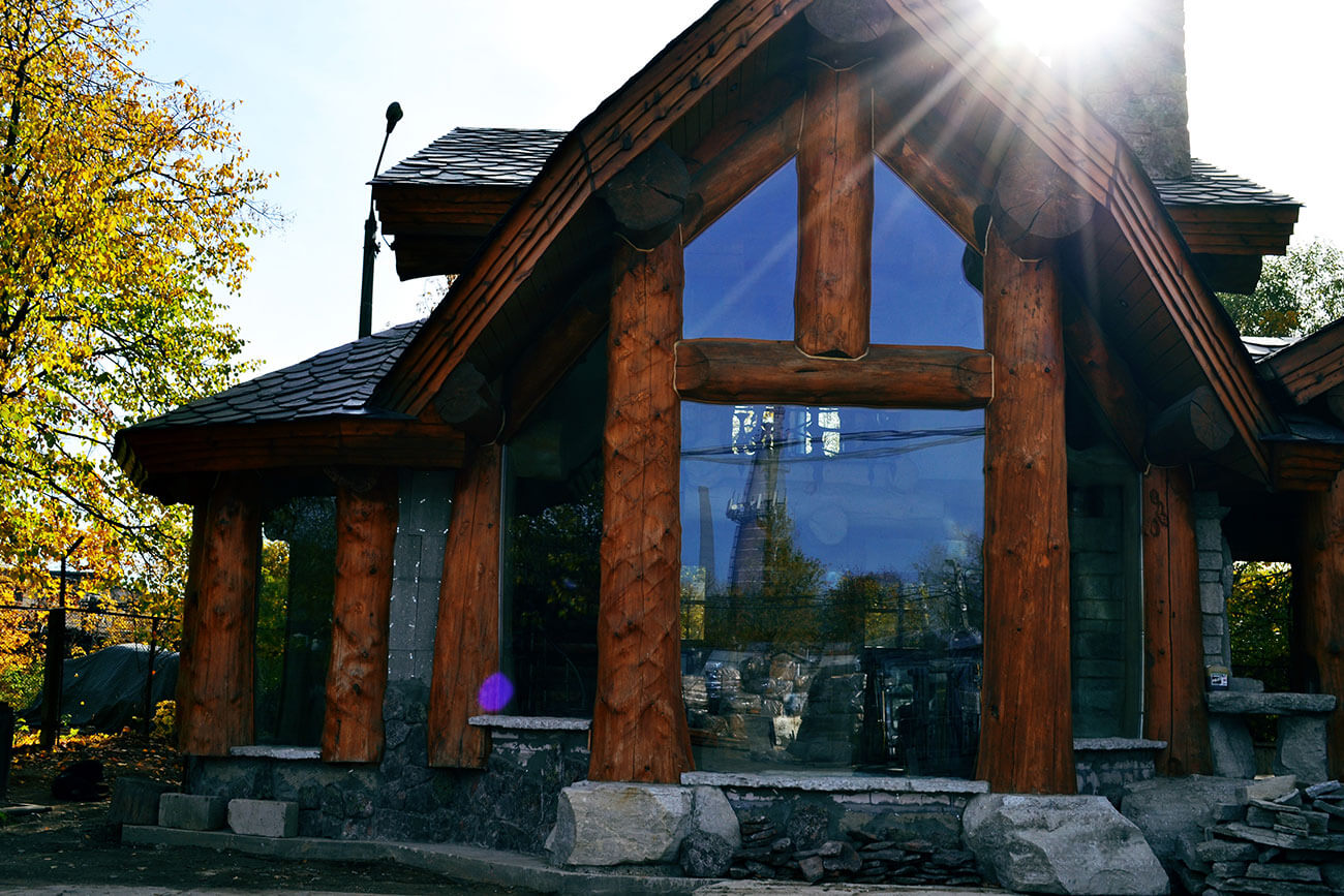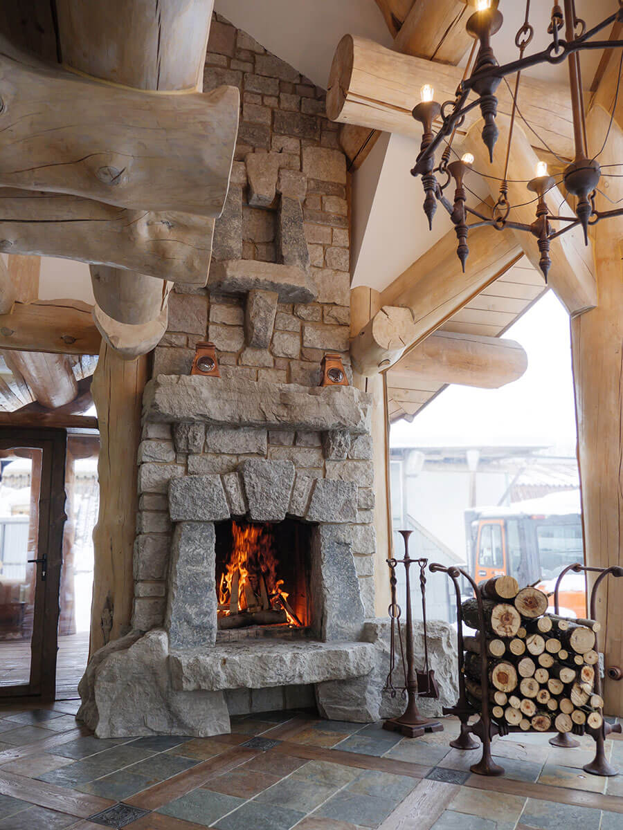 Камин плавно переходит в зону гостиной с помощью массивной полки и далее по всему дому композицию дополняют каменные подоконники изготовленные из однородного камня, и в сочетании с гигантскими бревнами и безрамным панорамным остеклением создают общую неповторимую картину интерьера. Таким образом, вся красота натурального камня со множеством уникальных элементов вплетена в интерьер деревянного дома — «Воздушного замка».