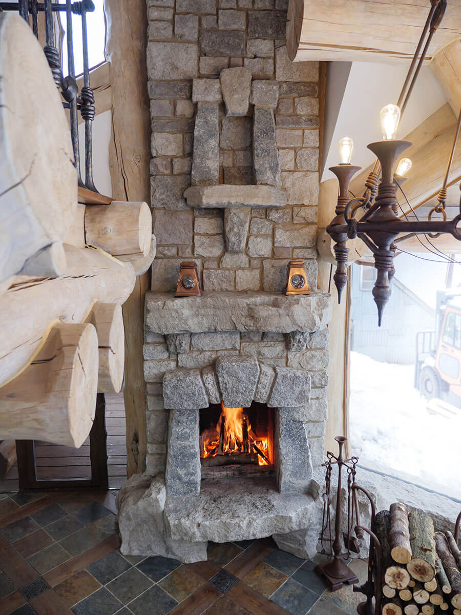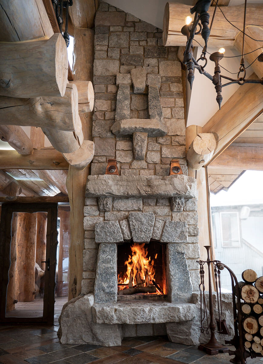 На проектирование потрачено очень много времени, так как готовых решений по дизайну не было, оттачивался каждый отдельный элемент камина, вплоть до кованых каминного набора с дровницей. Каждый камень для сооружения отбирался непосредственно в карьере, масса отдельных известняковых блоков — более тонны. При обработке поверхности поверхностей камня ставилась задача подчеркнуть красоту диких природных сколов натурального материала. Зона барбекю сочетается с каменной входной лестницей и большими глыбами, служащими опорами бревен в основании дома. При монтаже камина в основном использовался ручной труд.