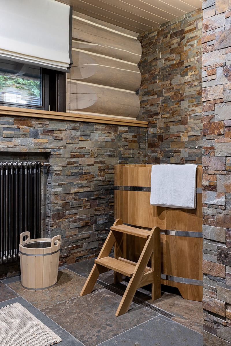 В ванной комнате — раковина ручной работы из окаменелого тысячелетнего дерева.