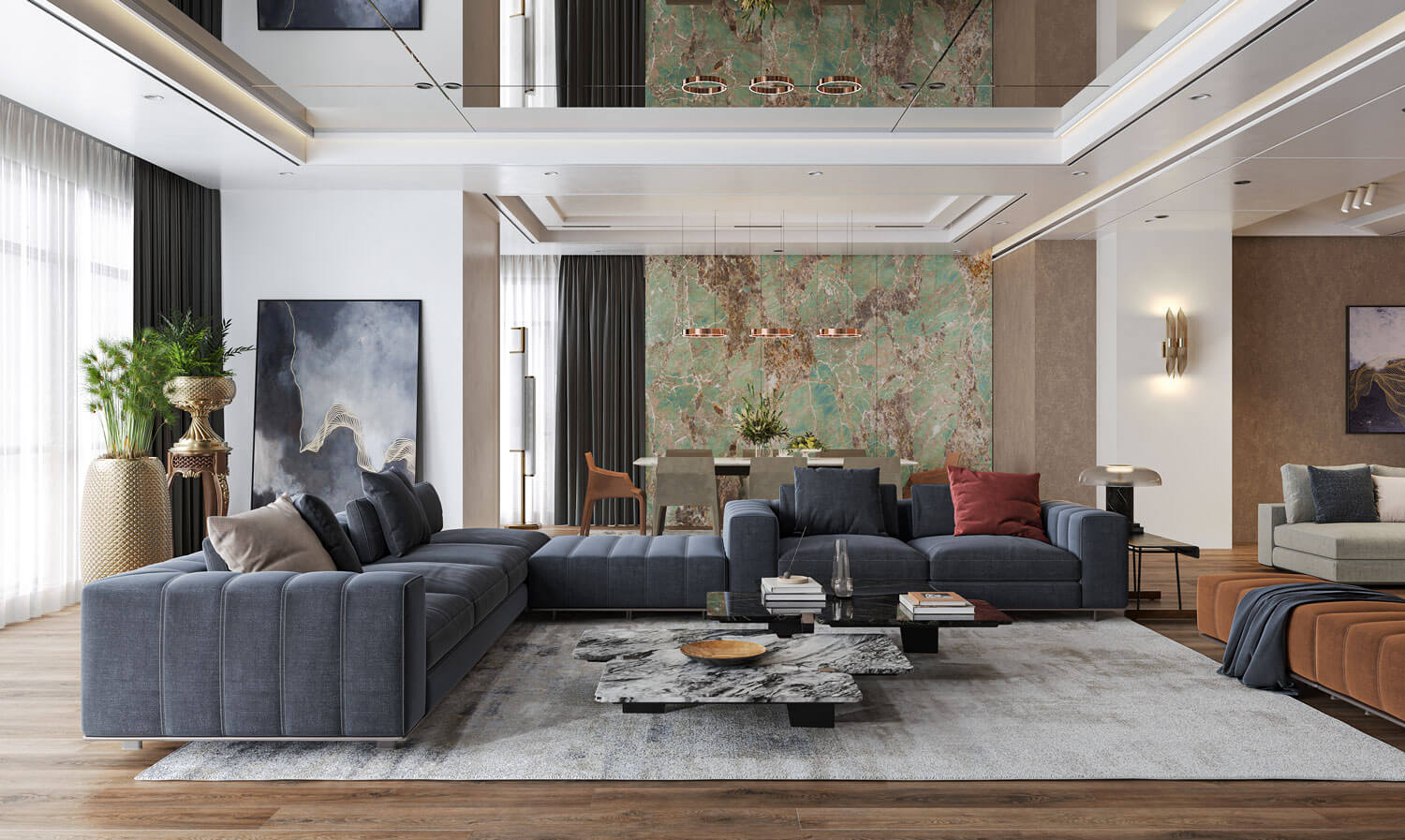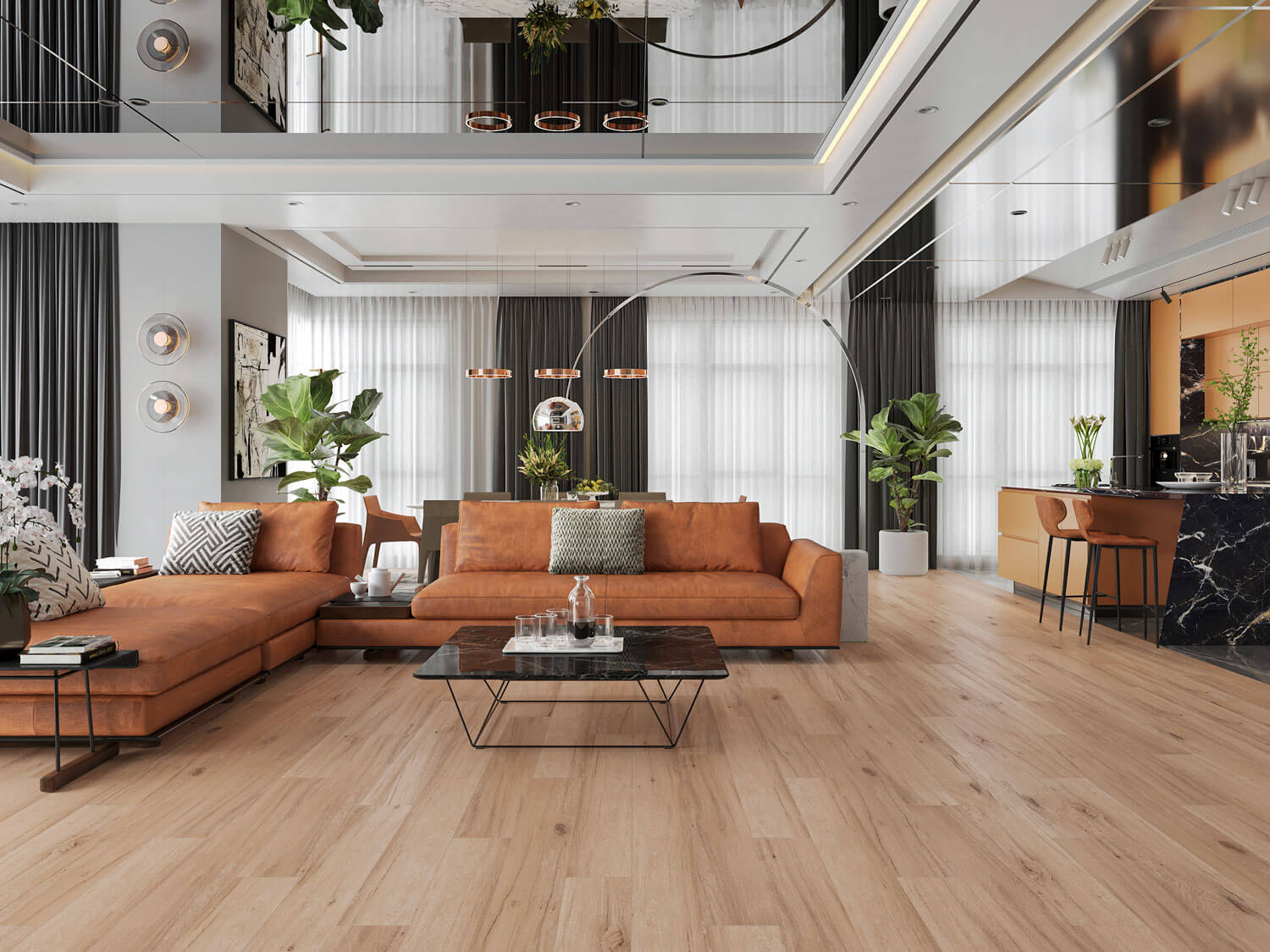 • Мягкие ковры, шторы, подушки на фоне керамогранитного пола создают контраст, добавляют теплые акценты и делают интерьер более уютным.