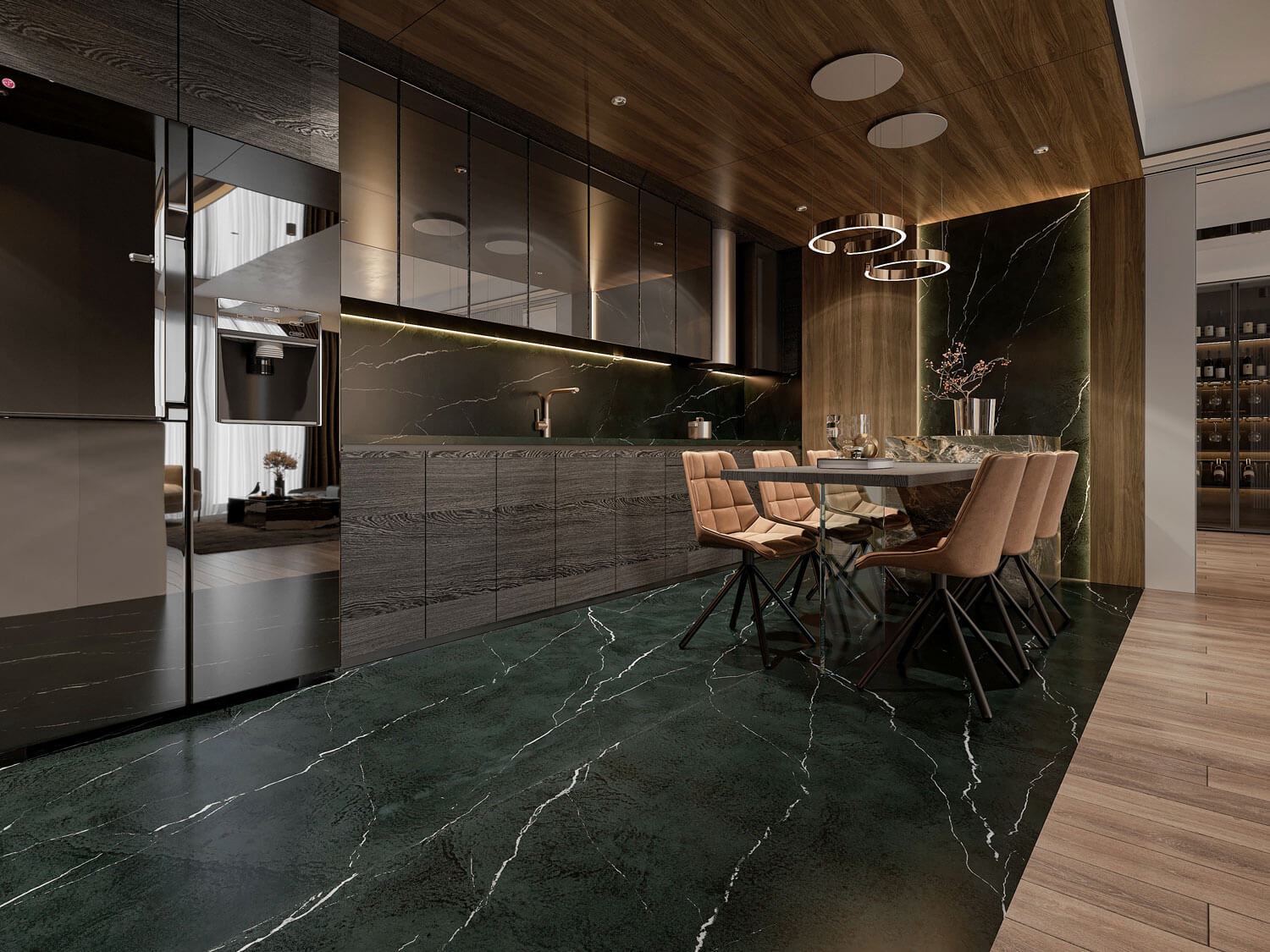 • Металлические элементы декора, карнизы, светильники в сочетании с керамогранитом придают интерьеру современный и технологичный вид.